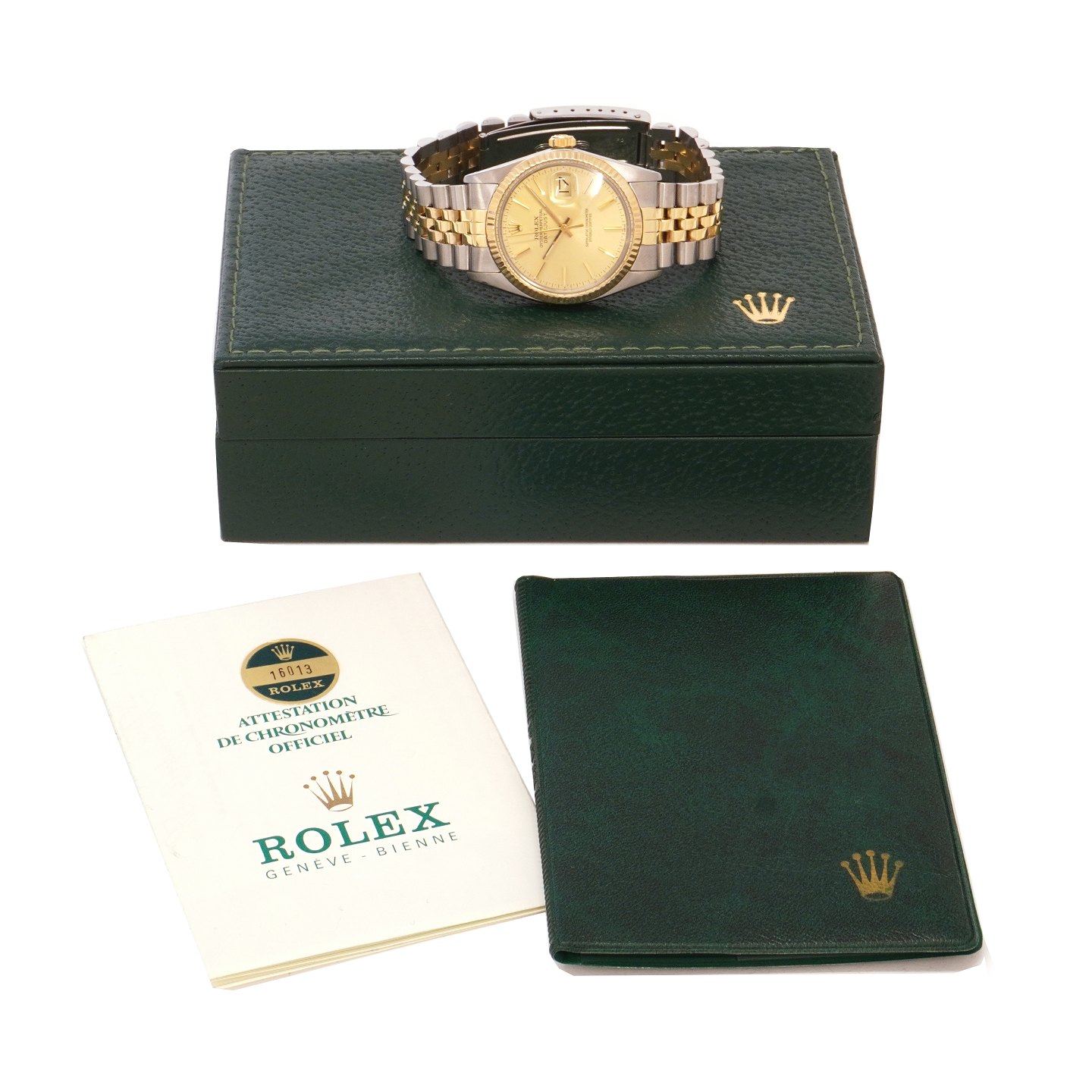 Rolex Oyster Perpetual Datejust g/s ref. 16013. Dansk sæt leveres med boks og certifikat dateret 08.03.1982, nyserviceret. D: 36mm
