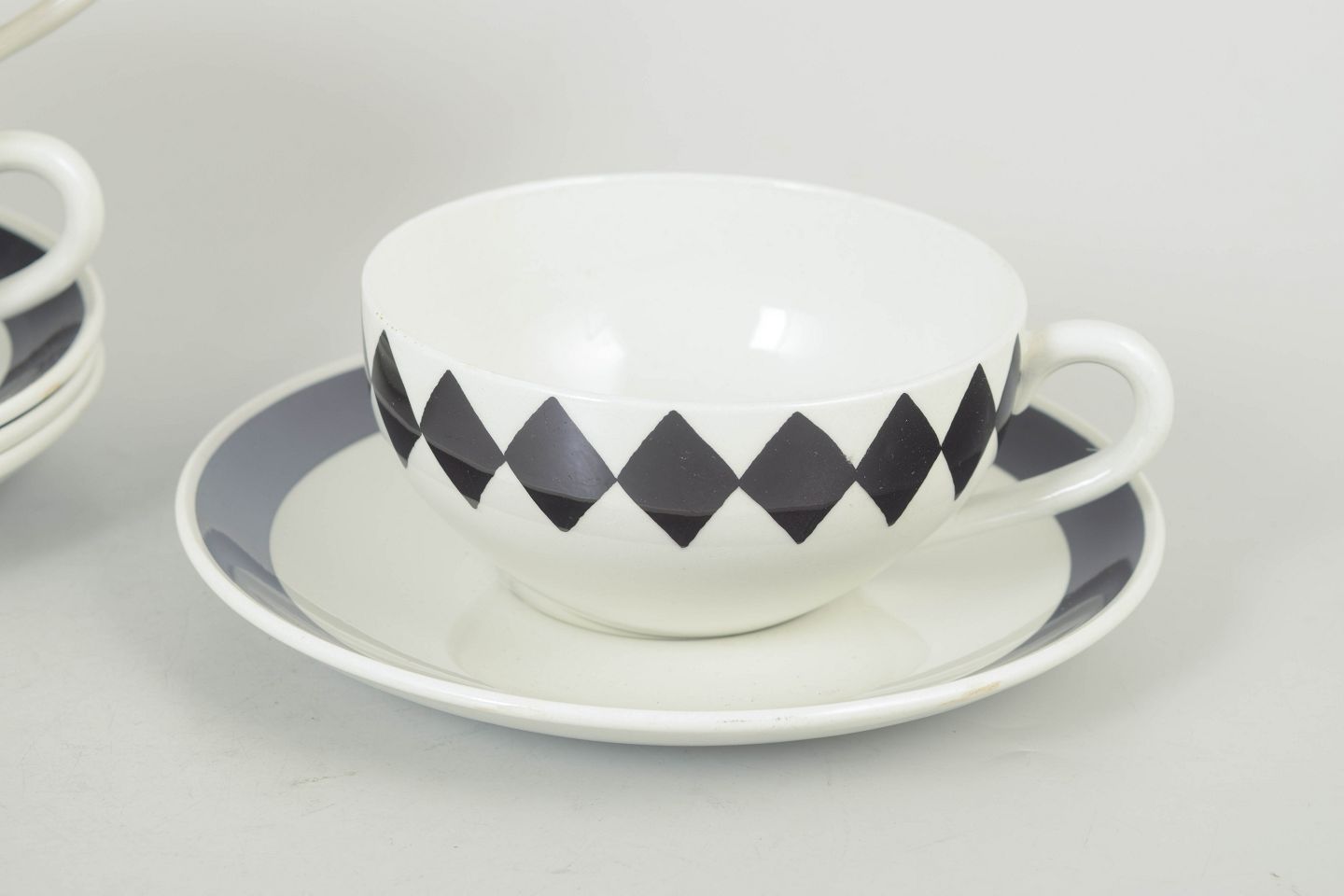 Sæt bestående af fire tekopper med tilhørende underkopper i porcelæn med karakteristisk sort rudemønster, udført i et enkelt og funktionelt formsprog fra perioden.