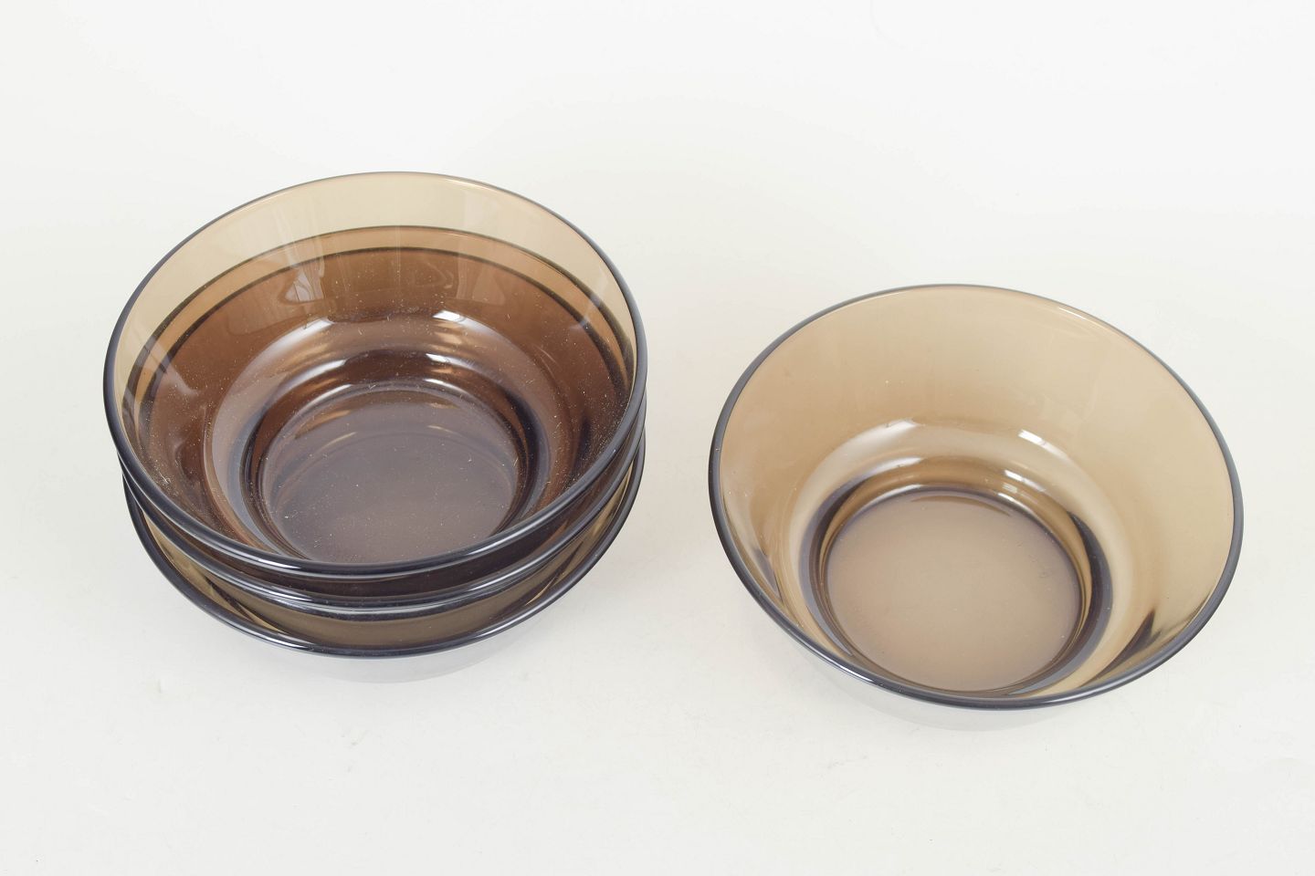 Fire stablebare skåle i presset glas med let konisk form og røgfarvet toning, fremstillet i Frankrig og mærket fra producenten.