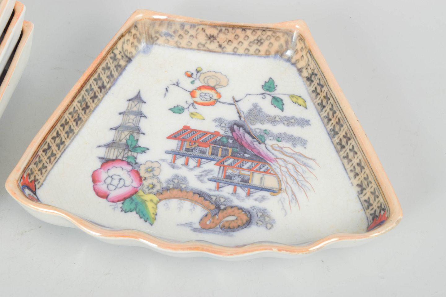 Dekorative firkantede fade i fajance med polykrom dekoration i orientalistisk japansk stil med pagodemotiv, fugl og blomster. Model Japan, produceret i perioden 1866–1925 og dateret til 1880’erne.