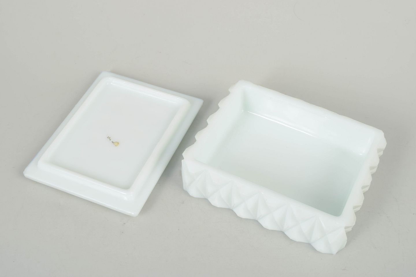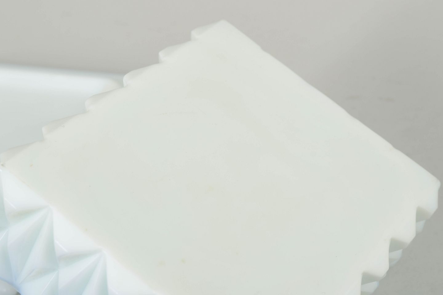 Rectangular lidded box in opaline glass with geometric relief decoration of repeating pyramid motifs. The white material has a subtle translucency that enhances the structured Art Deco design.