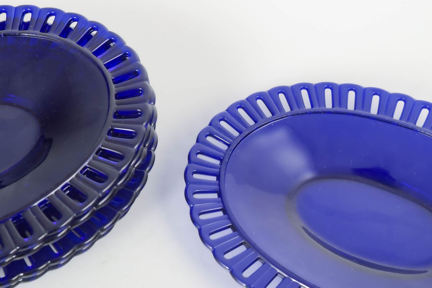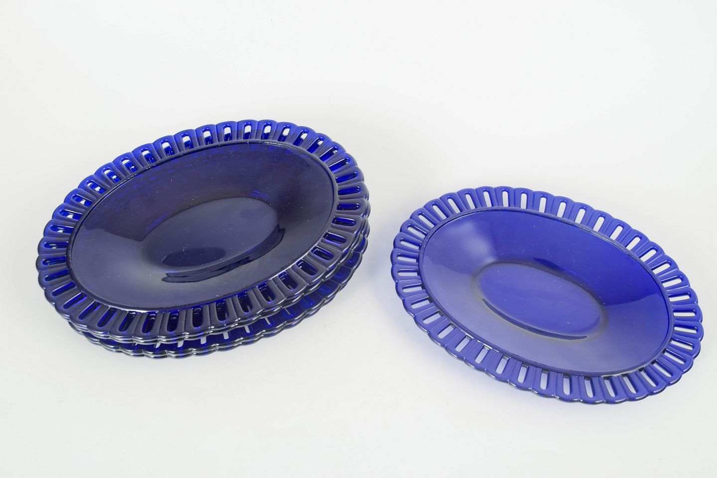 Elegante pressede glas tallerkener i dyb koboltblå farve med karakteristisk gennembrudt rand i filigranarbejde. Et markant eksempel på svensk glasdesign fra midten af det 20. århundrede.