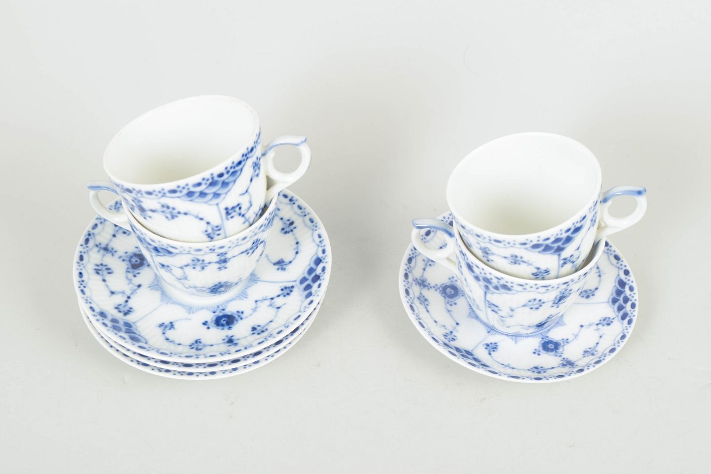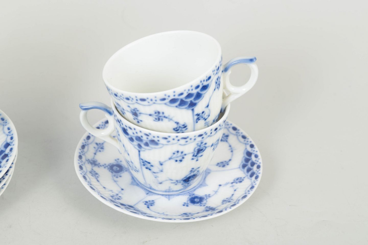 Håndmalet porcelæn i musselmalet halvblonde dekoration, model 1/527-528, første sortering. Kopper med tilhørende underkopper i klassisk riflet form.