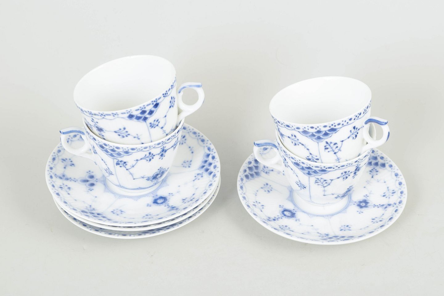 Royal Copenhagen Musselmalet Halvblonde, sæt af fire kaffekopper med underkopper.