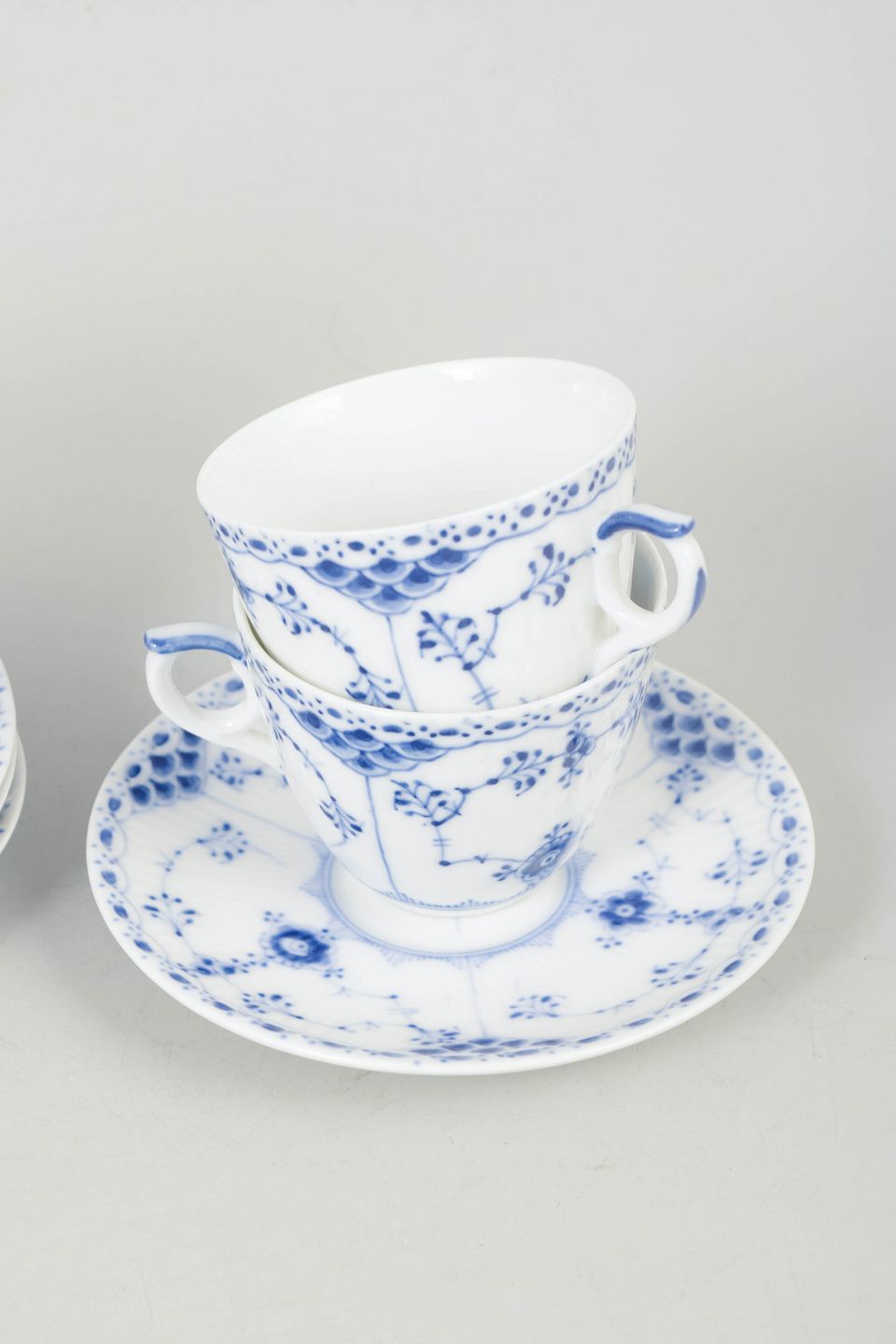 Den Kongelige Porcelænsfabrik blev grundlagt i 1775 i København og er kendt for sin høje kvalitet og håndværksmæssige tradition. Musselmalet halvblonde er en videreudvikling af det klassiske riflet stel, hvor det åbne blondearbejde langs kanten giver et mere dekorativt og raffineret udtryk, stadig håndmalet efter traditionelle metoder.