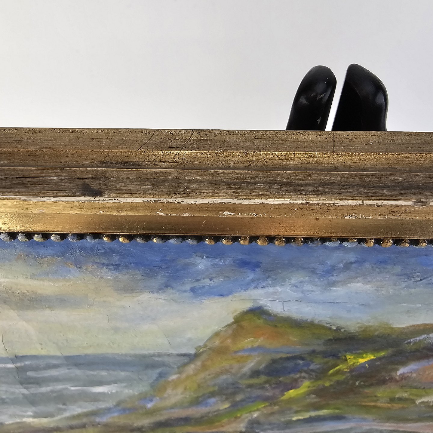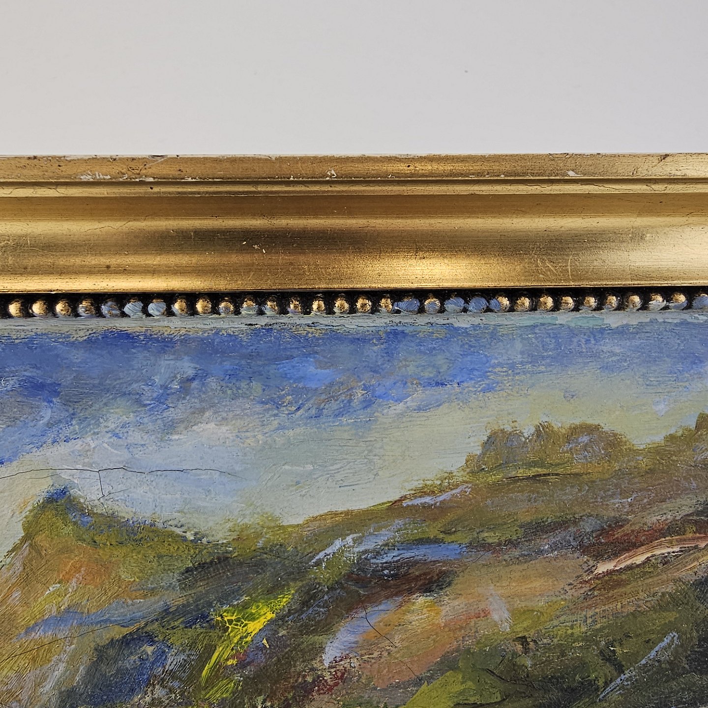 Oliemaleri på lærred med naturmotiv monteret i guldmalet træramme