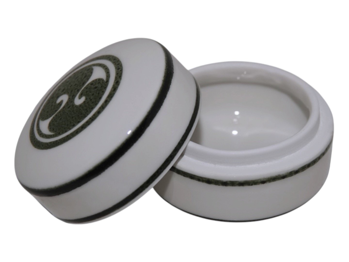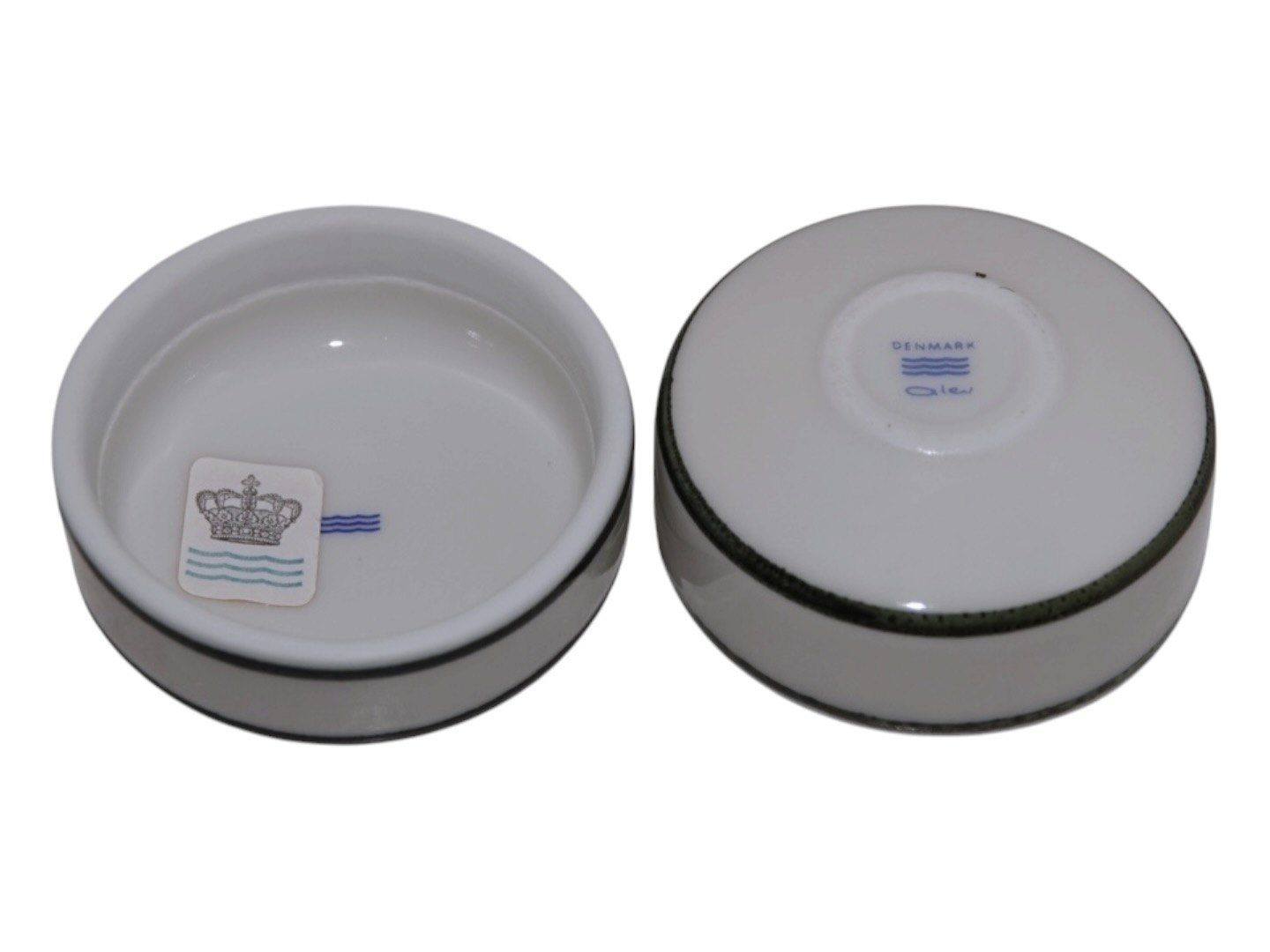 Royal Copenhagen kunstporcelæn, lille lågkrukke med grøn dekoration designet af Alev Siesbye.