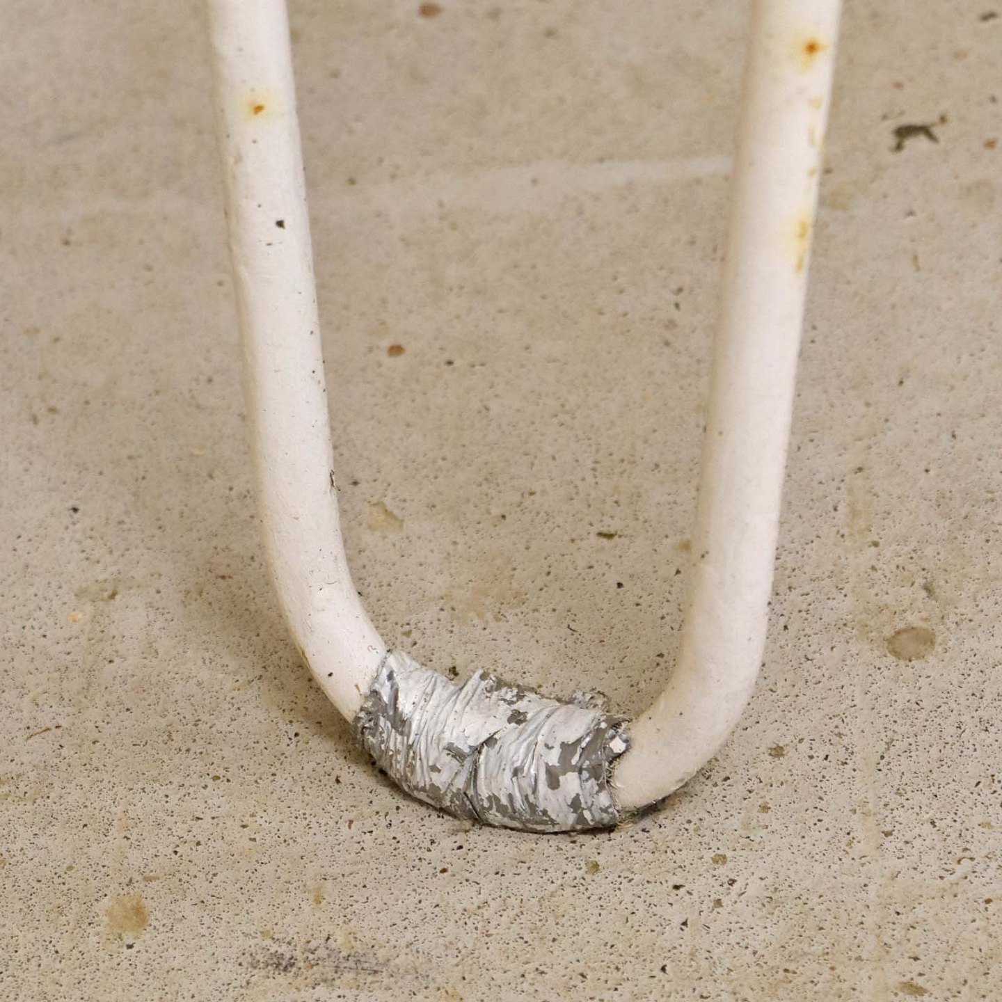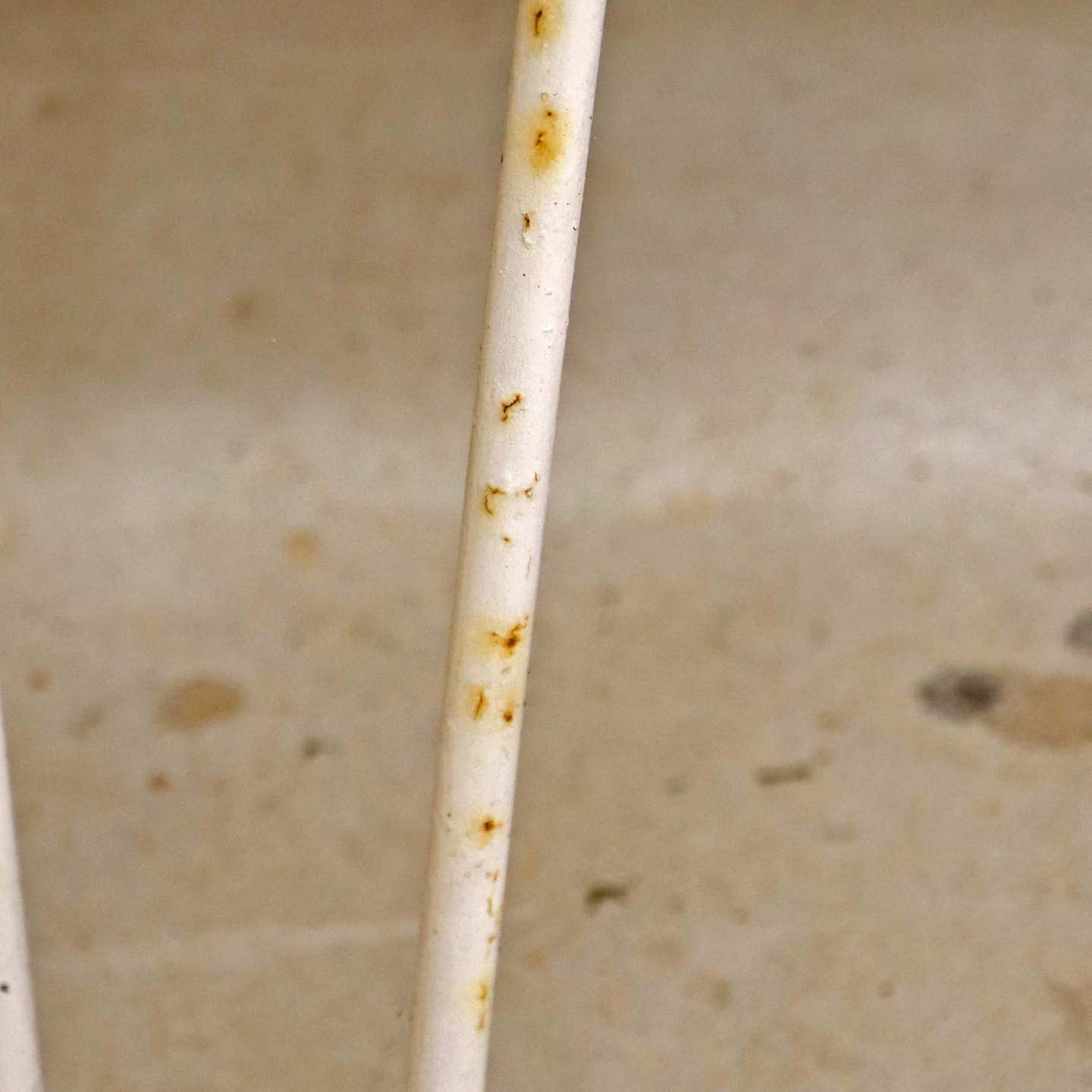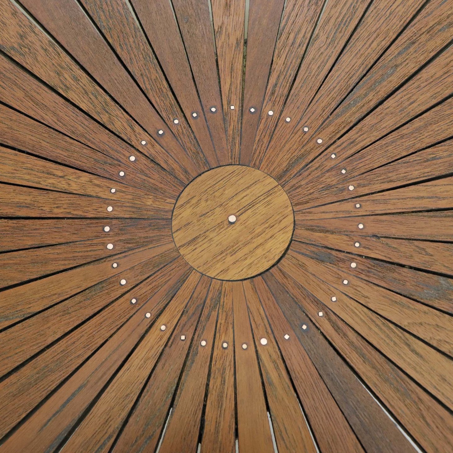 Rundt havebord fra år 1950-60 med nyrenoverede lameller i teaktræ med messingpynt på stel af hvidlakeret stålrør. Benene er ikke renoveret.