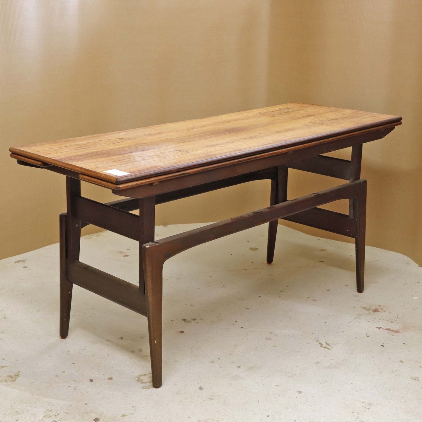 Sofa- og spisebord i samme møbel. Bordet er fremstillet i lakeret palisander og har to underliggende udtræksplader, som befinder sig på hver af bordets lang-sider.