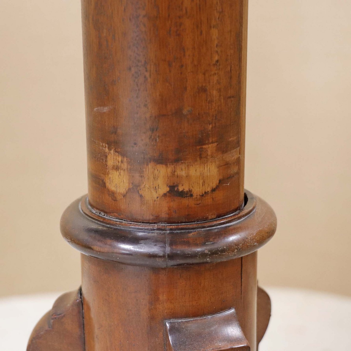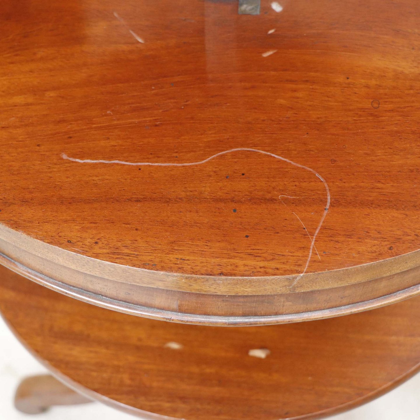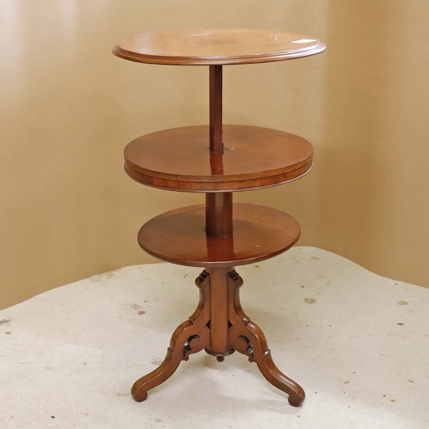 Et ældre serveringsbord på tre fødder i lakeret maghoni med tre etager. Opsatsdelen kan slås sammen til et bord.