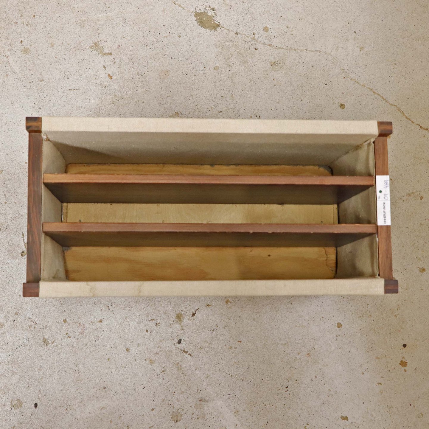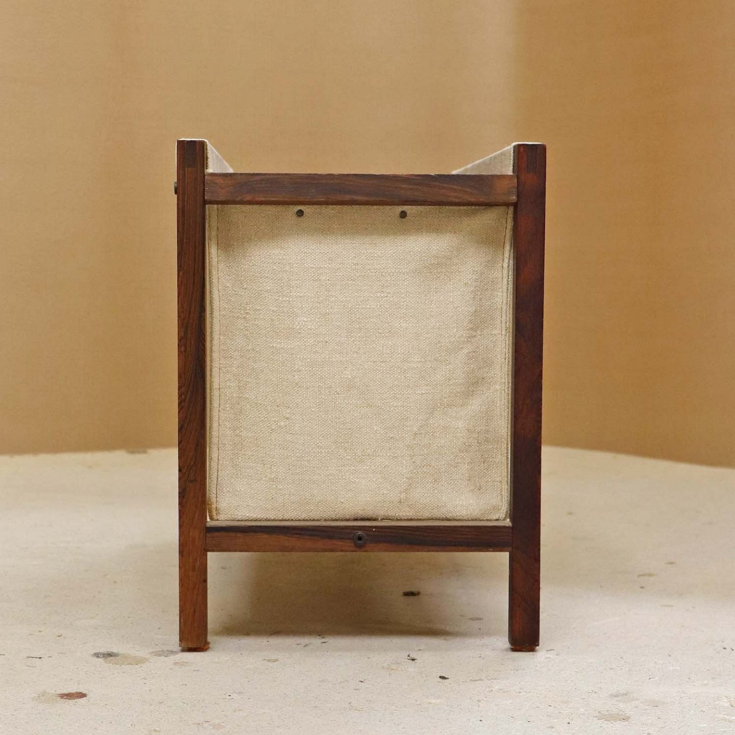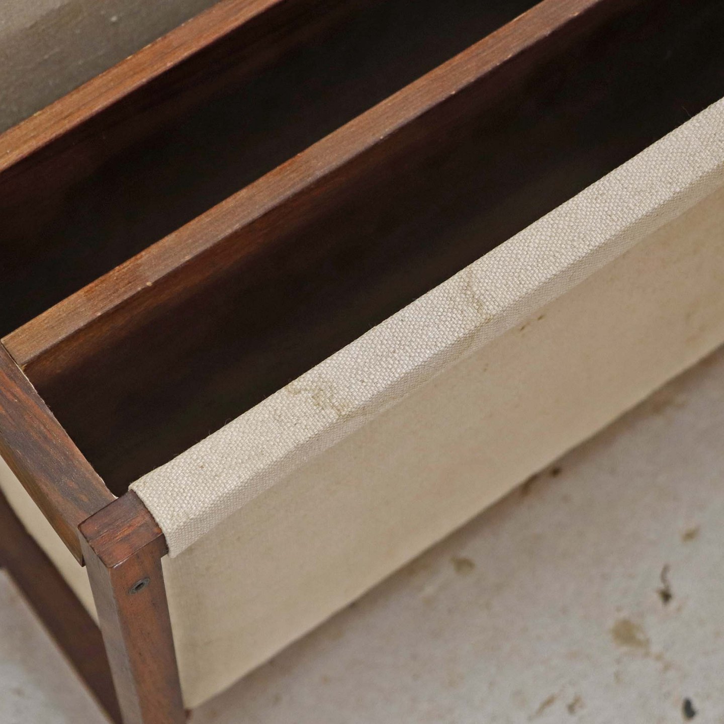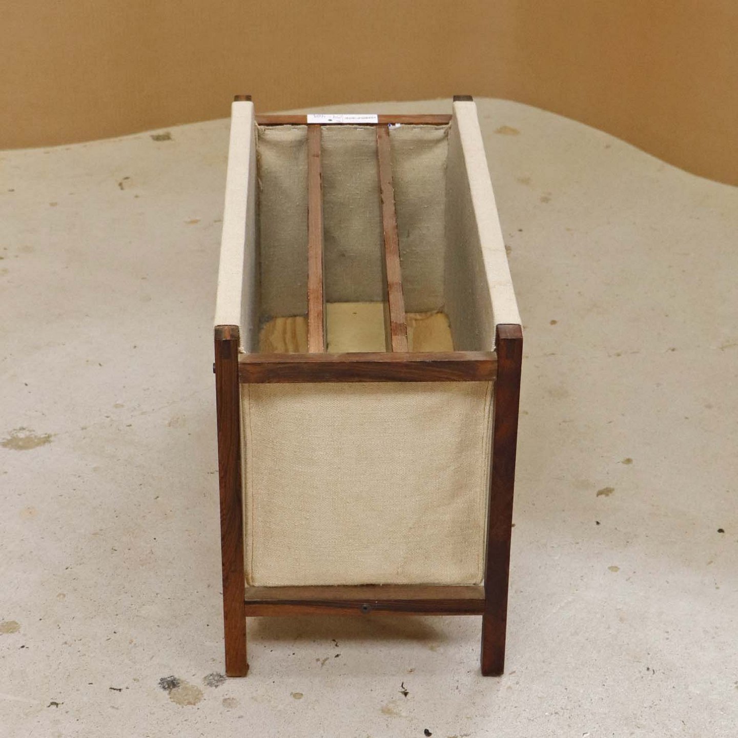 Magasinholder med stel i palisander med påmonteret sandfarvet lærredsstof. Holderen har tre indvendige rum.