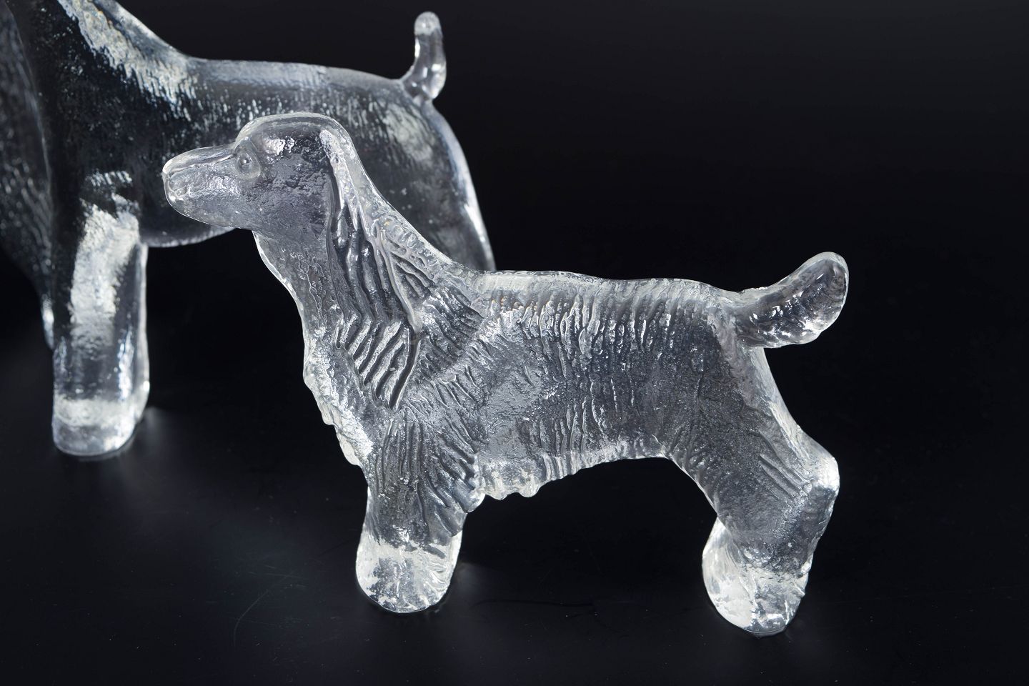 Sæt af fire skulpturelle hundefigurer i klart kunstglas med struktureret overflade, formgivet af Bertil Vallien for Kosta Boda. Figurenes organiske former og lette mattering giver et levende og karakterfuldt udtryk. Én med original æske.