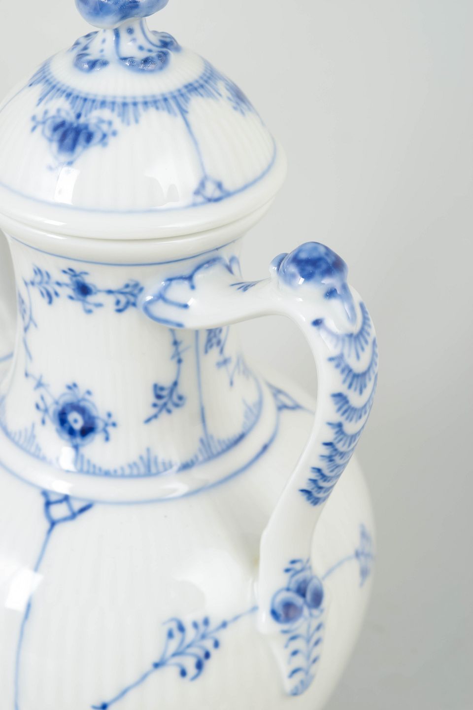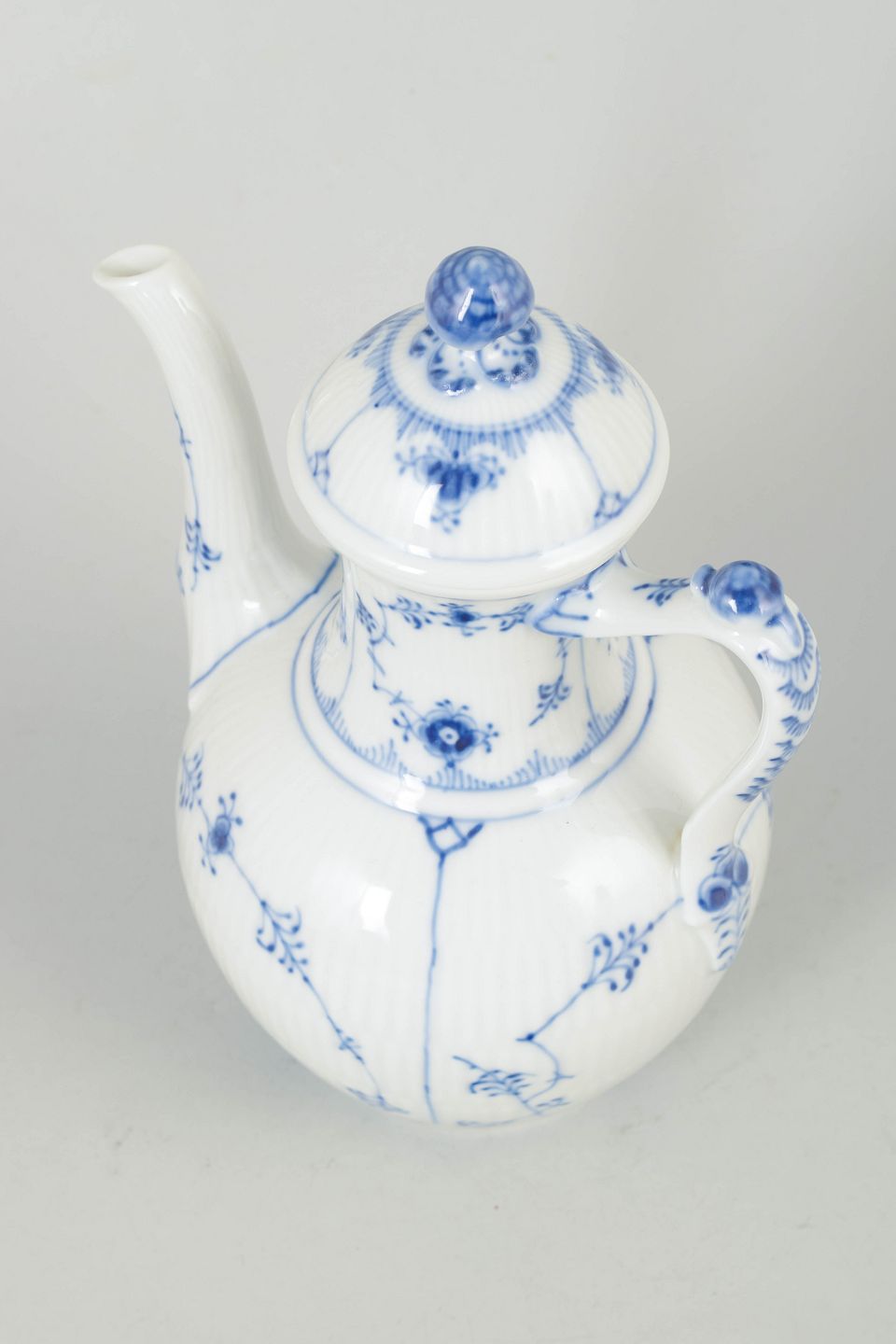 Elegant espressokande i hvidt porcelæn med håndmalet blå musselmalet riflet dekoration, model 1/47 fra 1960, 1. sortering.