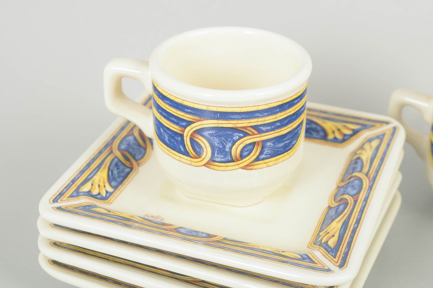 Dekorativt sæt i keramik bestående af fire espressokopper med tilhørende underkopper, dekoreret i blå, gule og gyldne toner med ornamentale mønstre.