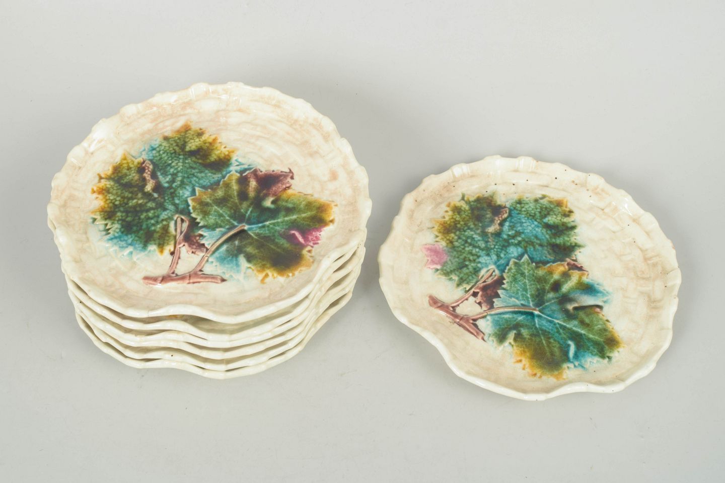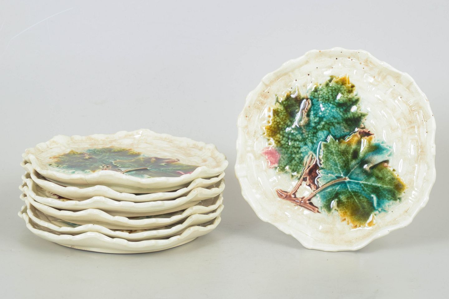 Dekorative tallerkener i glaseret fajance med reliefpræget og naturalistisk blomsterdekoration i farverig majolika glasur. Stemplet.