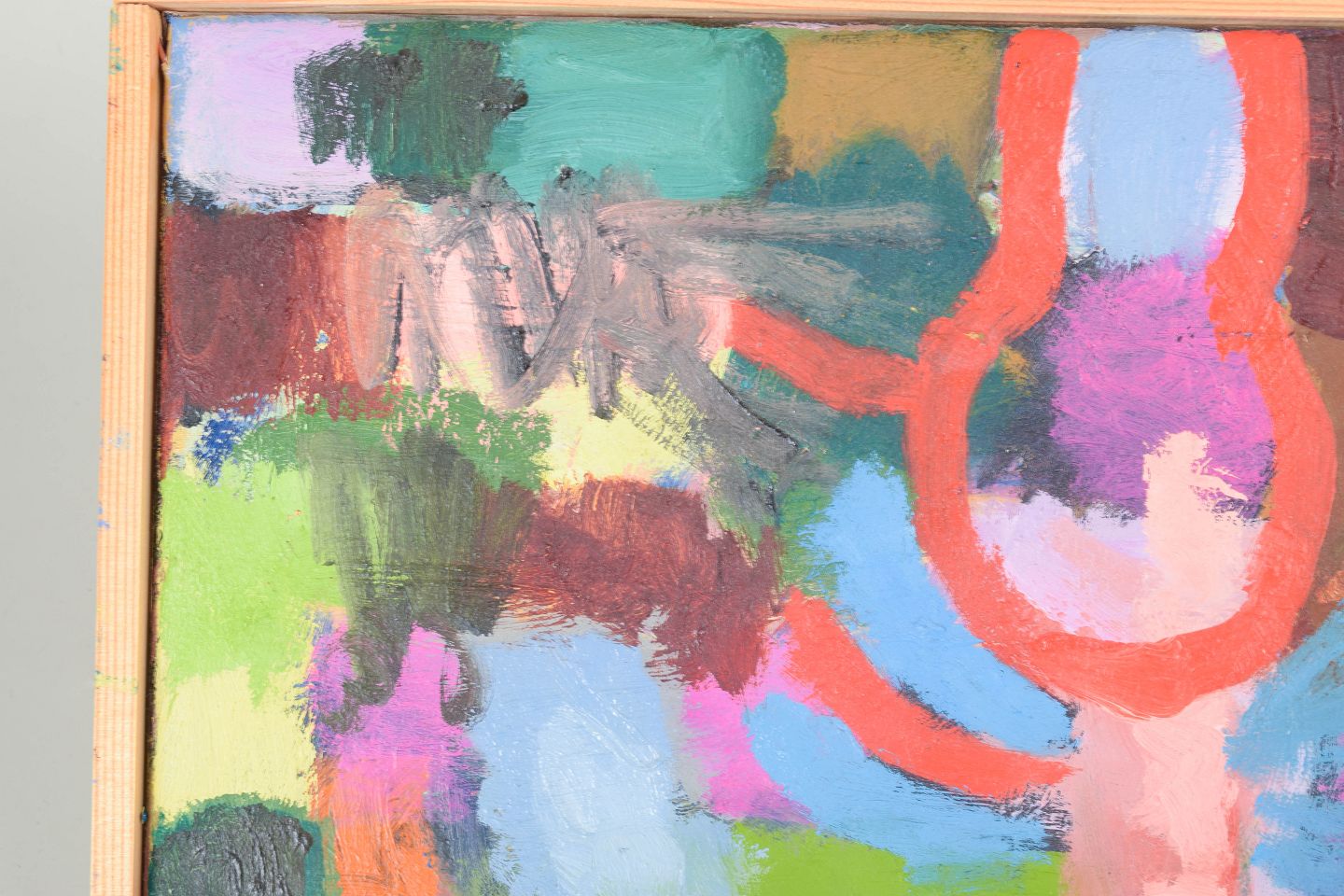Abstrakt komposition med geometriske former og kraftfulde farvefelter udført i olie på lærred, usigneret.