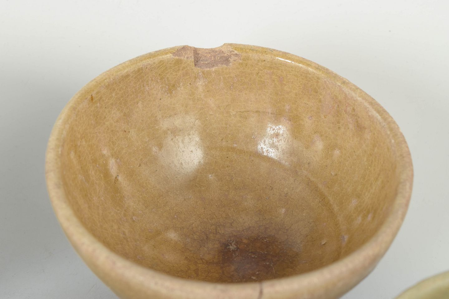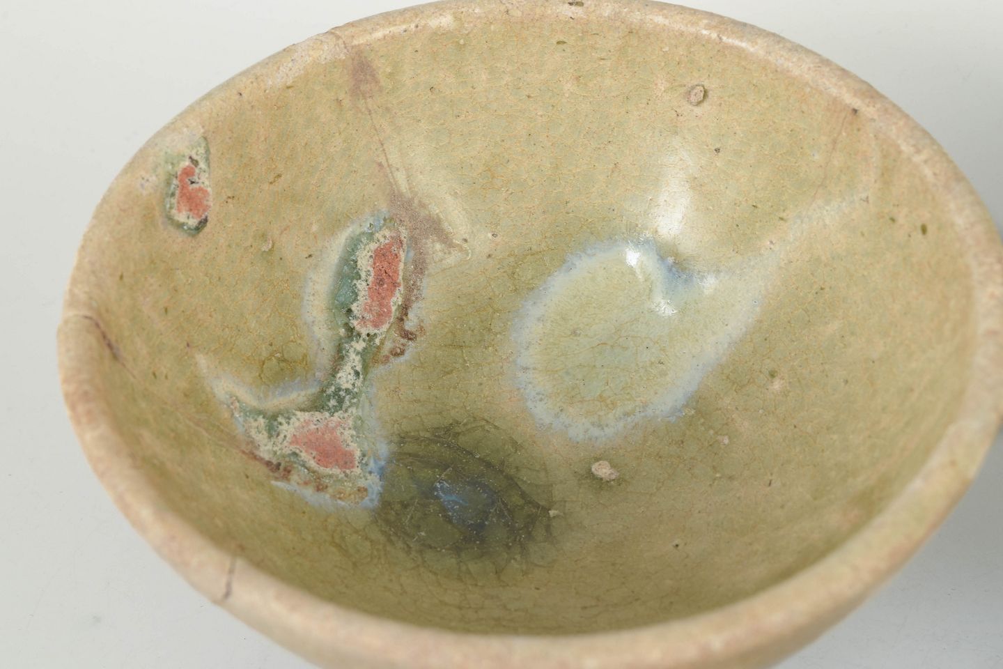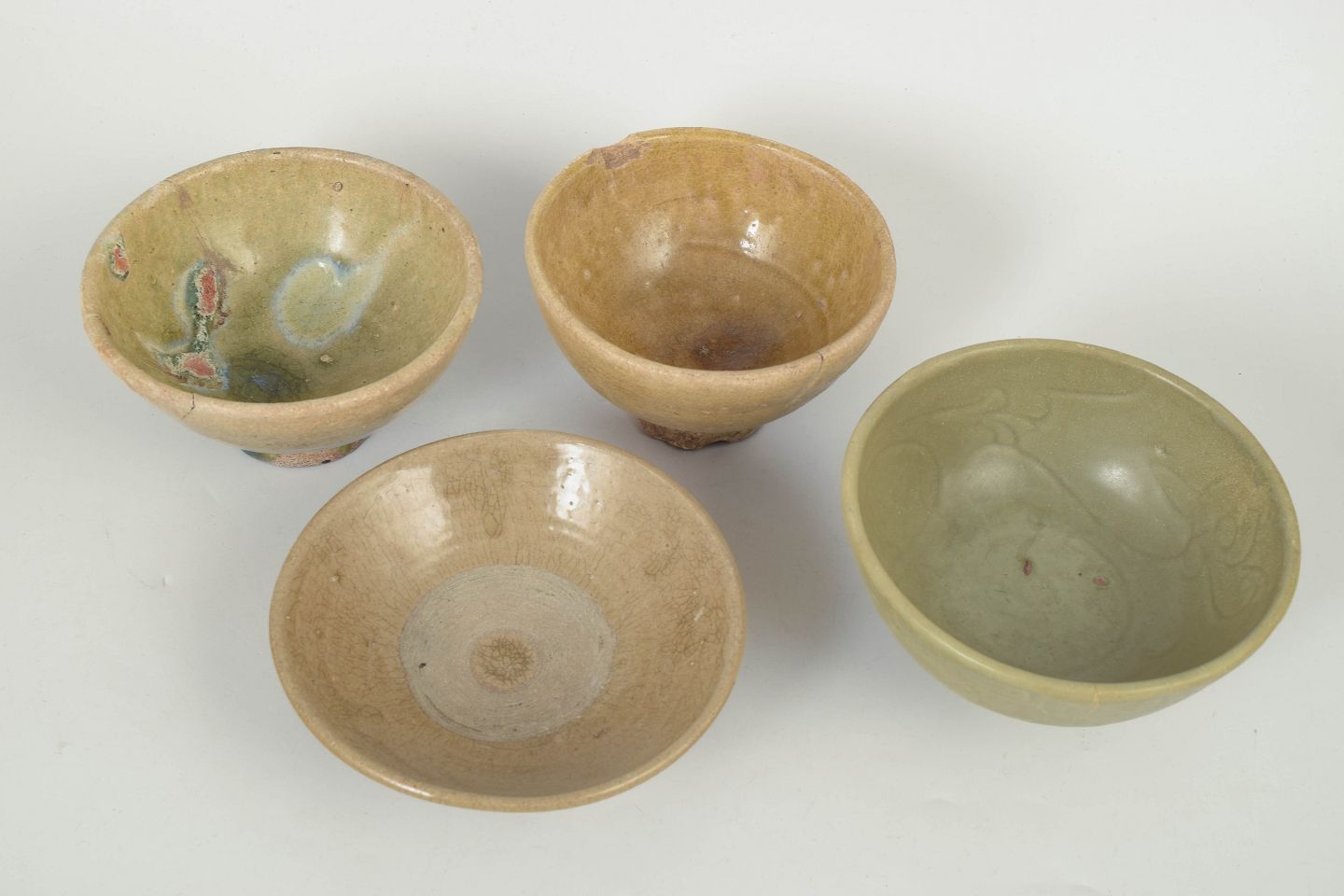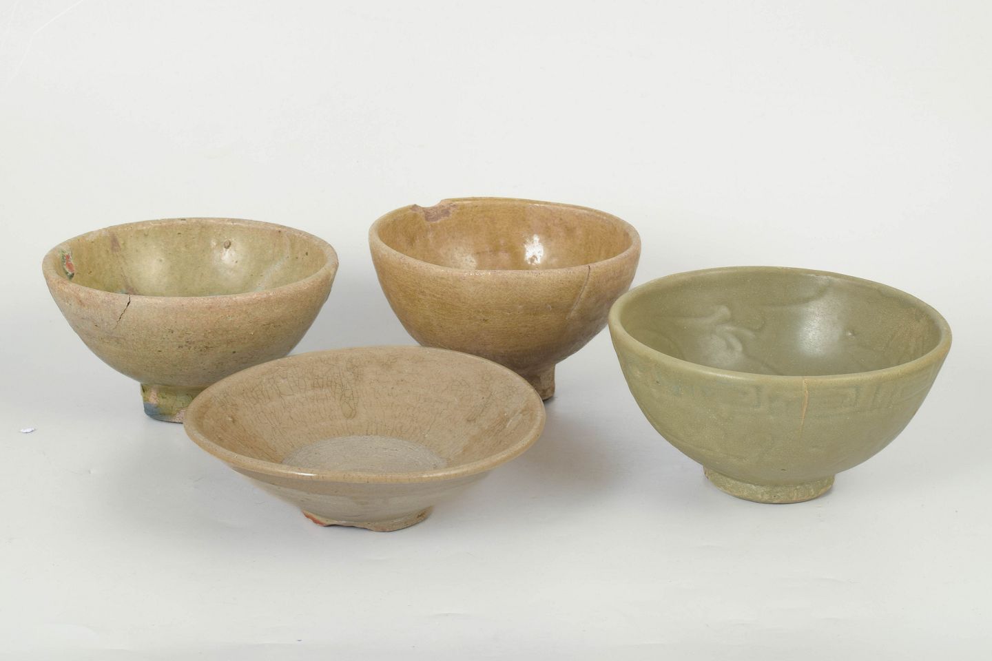 Fire hånddrejede keramiske skåle med varierende glasurer, herunder celadon og jordfarvede toner, med synlige spor af alder og brug samt traditionelle former fra perioden.
