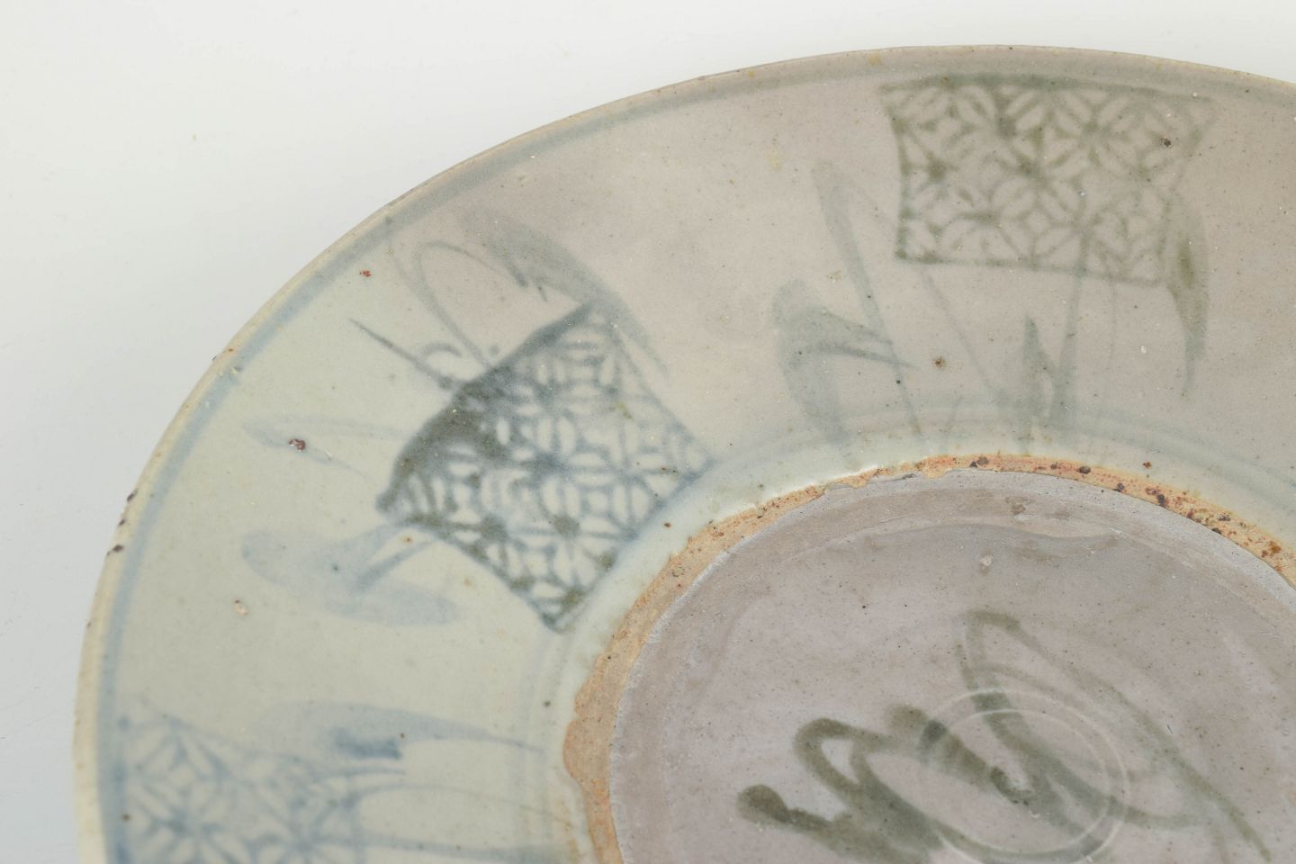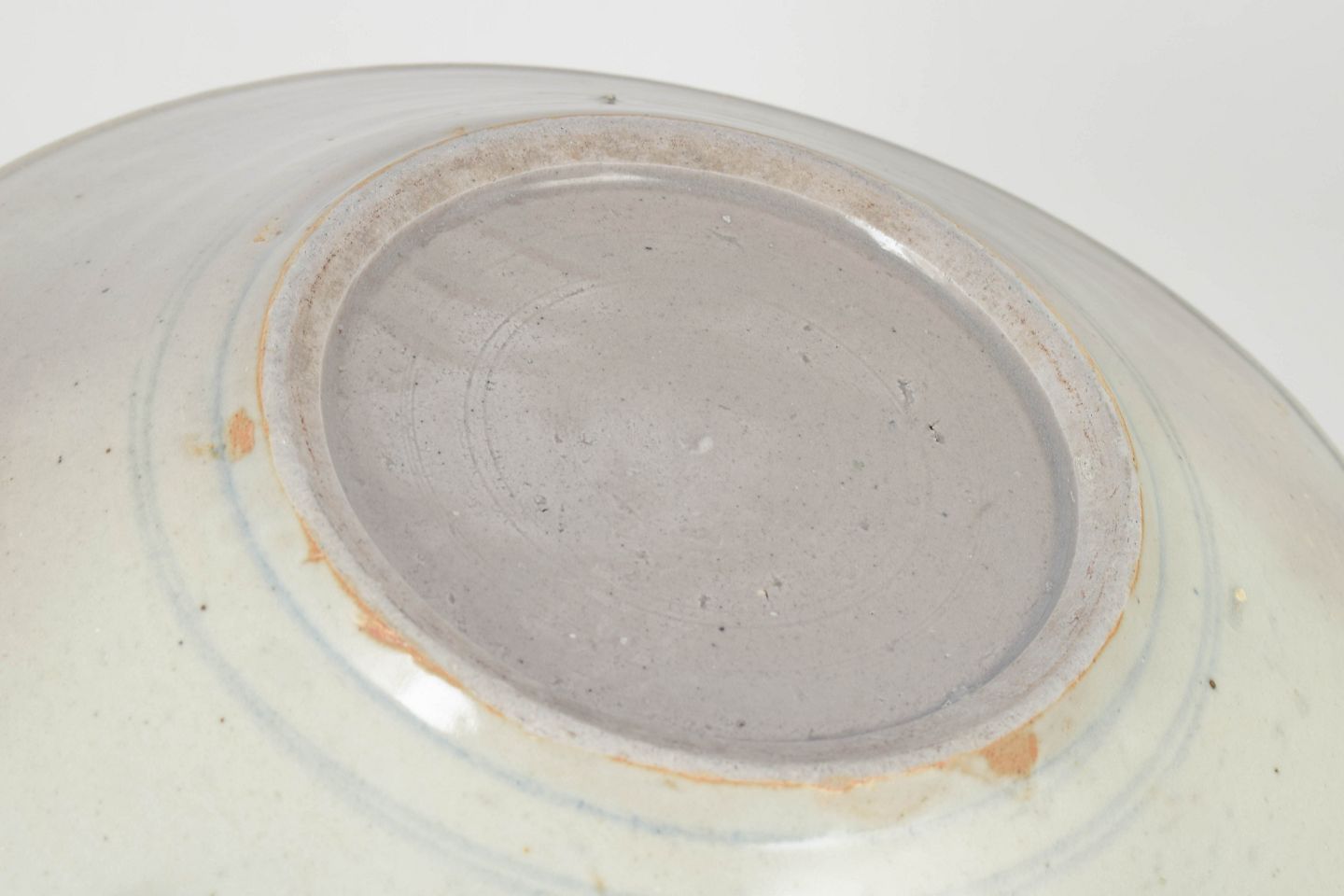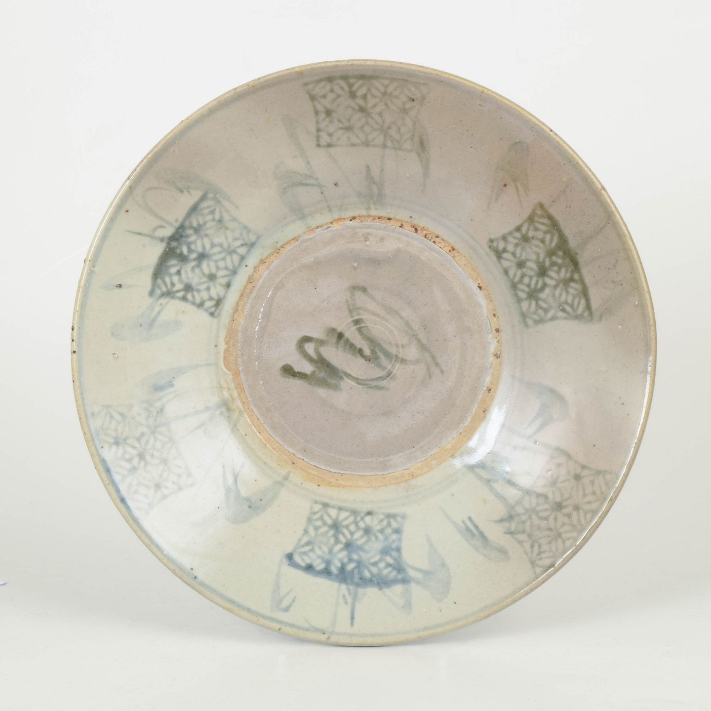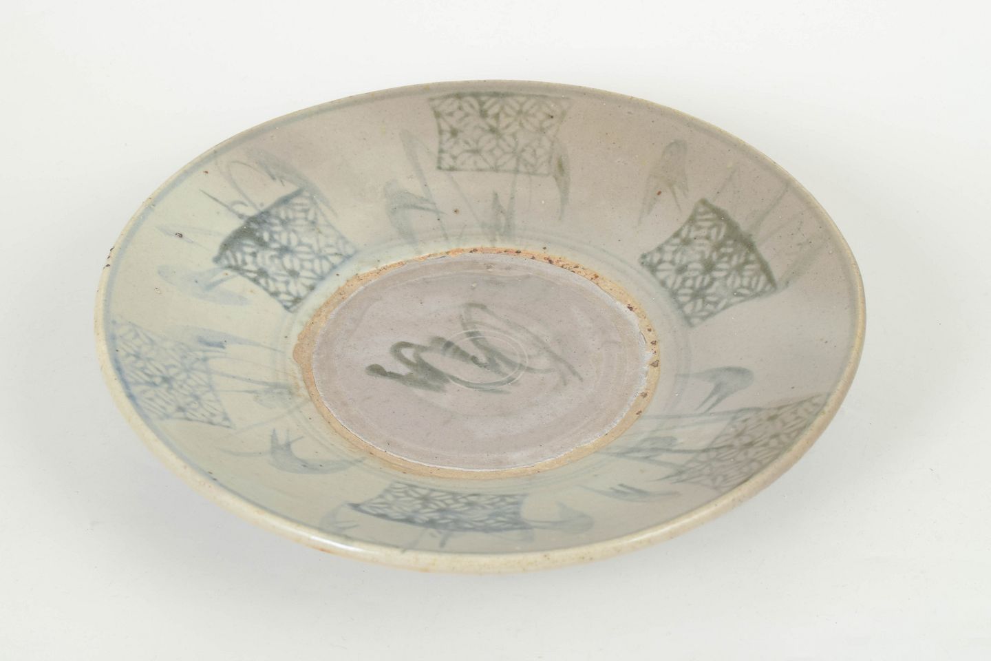 Stort hånddrejet porcelænsfad med dekoration i blå underglasur, udført med stiliserede motiver og fri penselføring typisk for perioden.