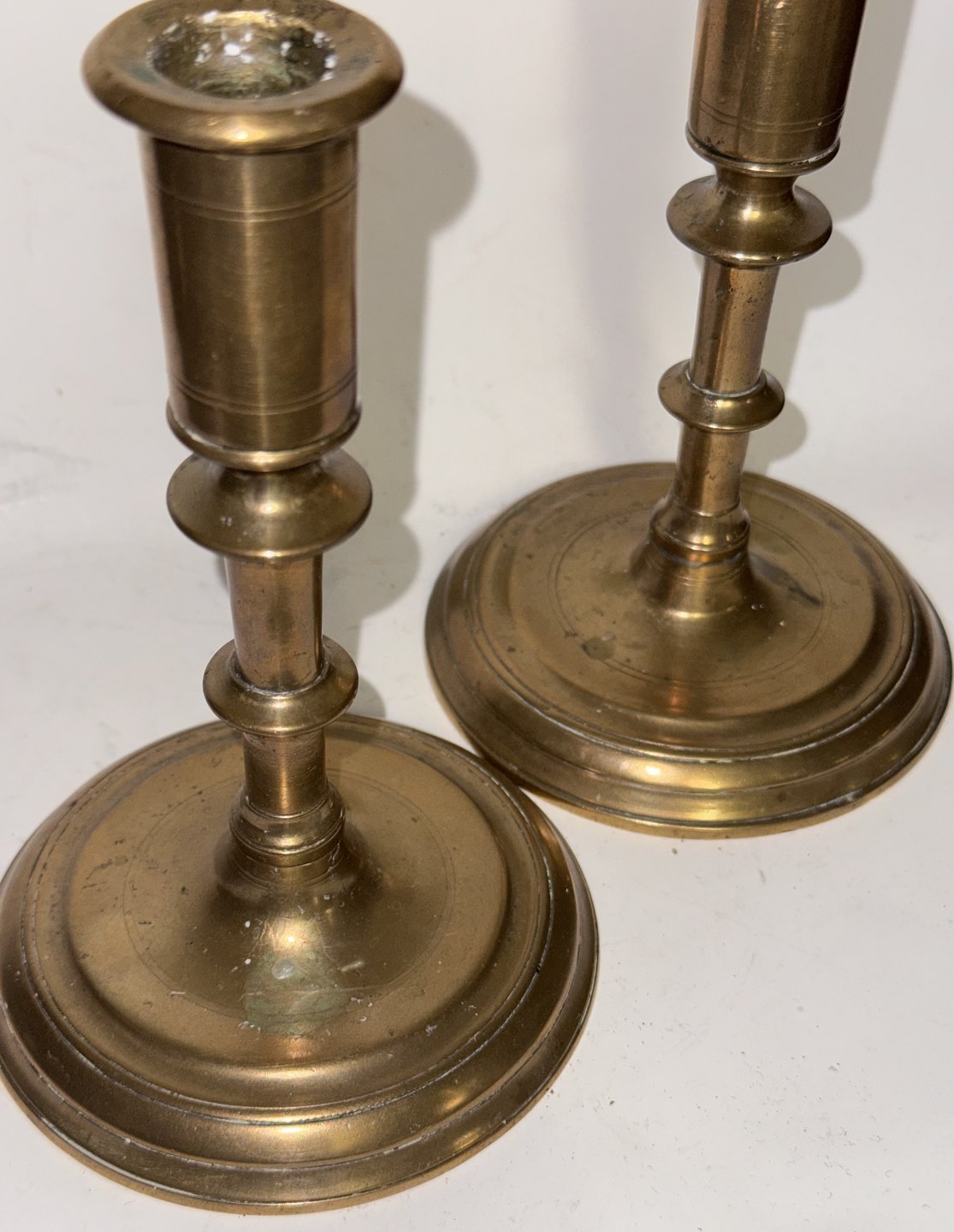Par lysestager i barok-stil. Formodes at være fremstillet i første halvdel af 1700-tallet. Fremstår i god stand. Den ene stage er loddet. På den anden er det muligt at skrue “piben” af foden. H. 15,3 cm