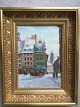 Oliemaleri af Svend Nielsen i guldramme, forestillende en vinterscene med ...