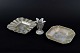 Lille vikingeskibsformet skål i tin sammen med to ...