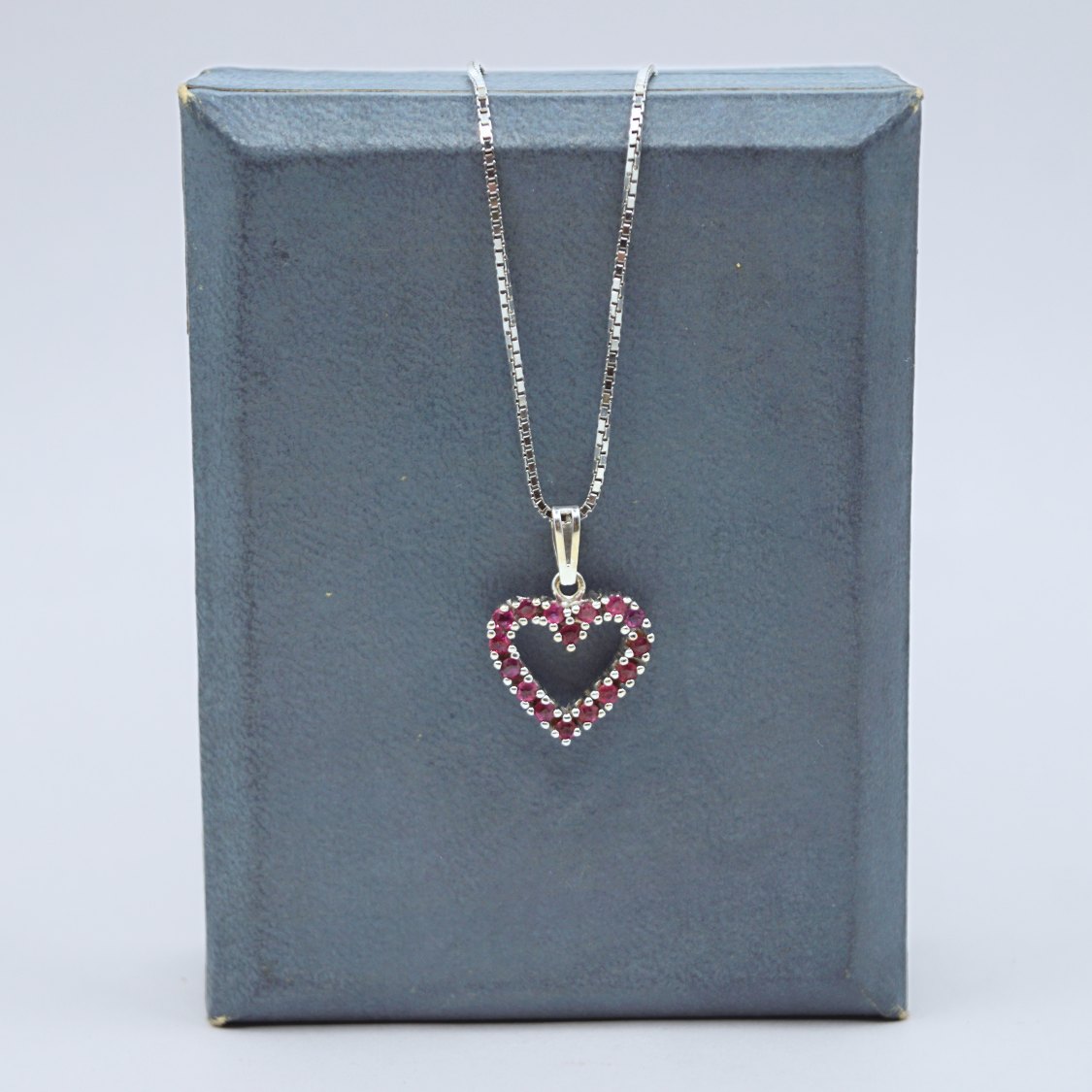 Henrik Solskov; A necklace in 14k white gold set with a heart shaped ruby pendant. Rubies mounted in 14k white gold. Necklace l. 42 cm. Pendant h. 1,3 cm, w. 1,4 cm.