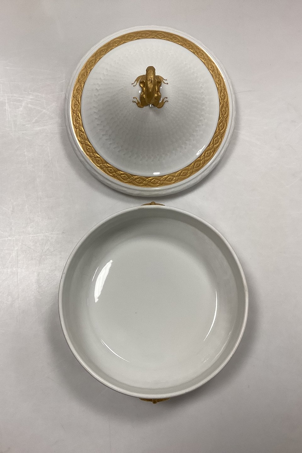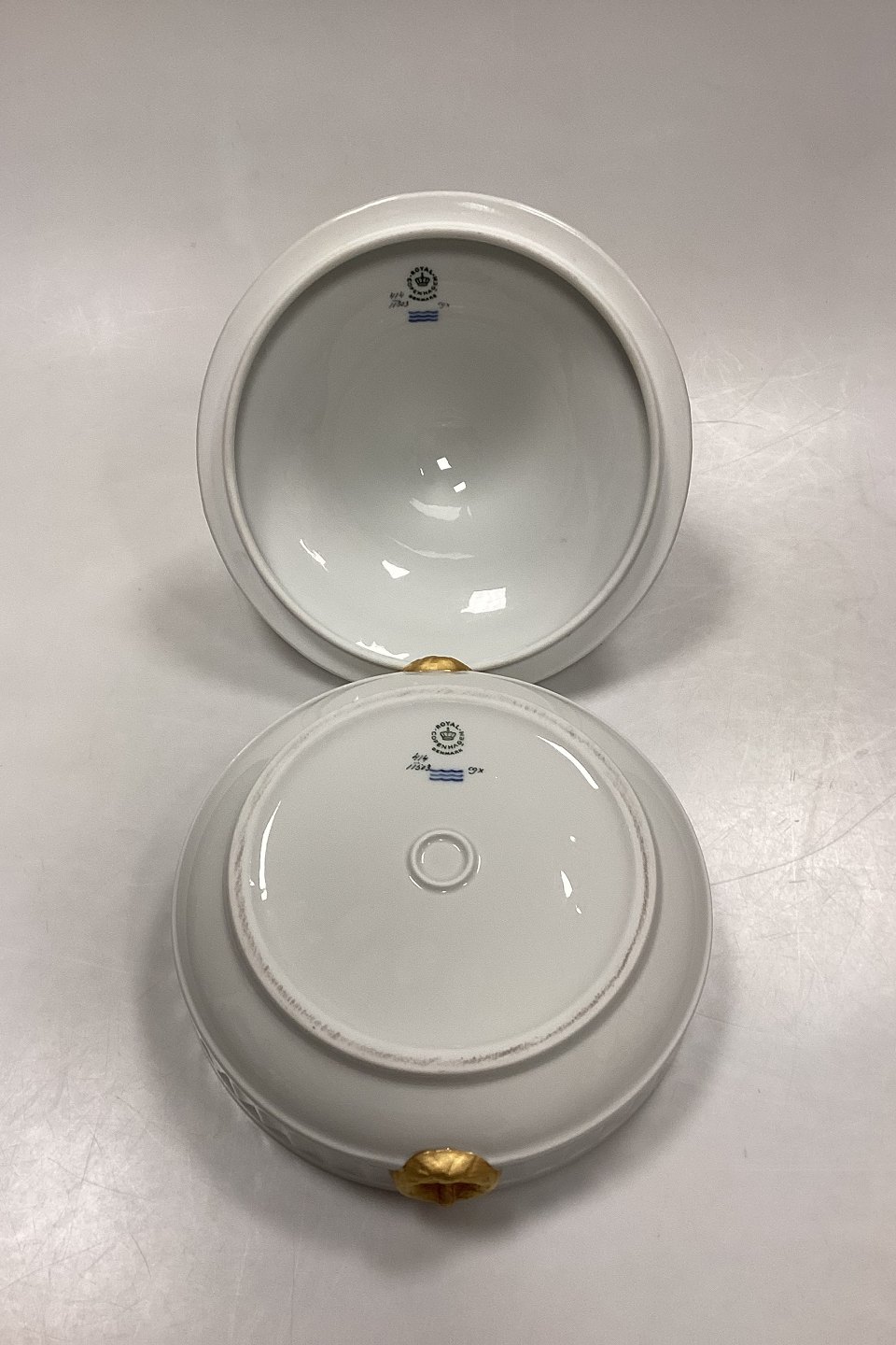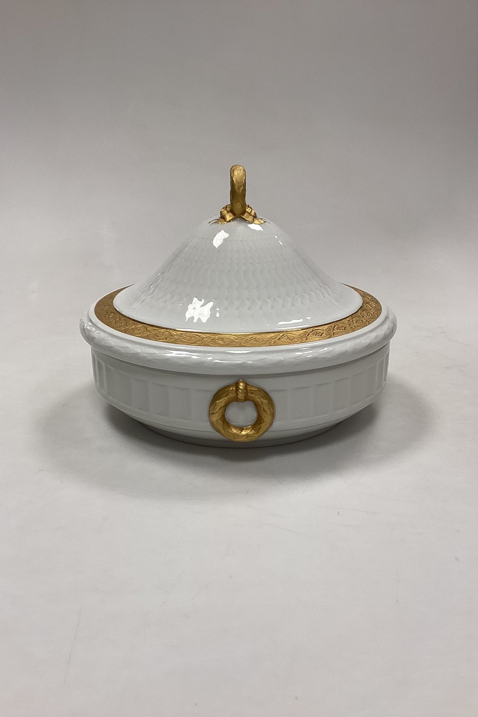 Royal Copenhagen Gold Fan lidded bowl No 11503. Measures 22cm x 16,5cm and is in good condition.