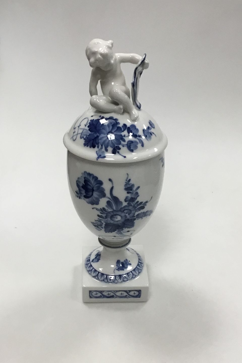 Royal Copenhagen Blue Flower Lidded Cup with Putti on top No 1754. Measures 29 cm / 11.42 in.