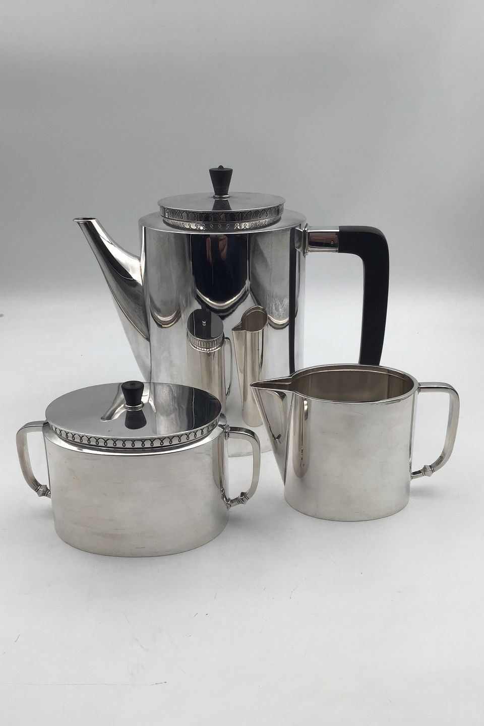 Hans Hansen Sterling Silver Coffee Set Consists of coffee pot, creamer and sugar bowl No 458 by Karl Gustav Hansen. Coffee Pot with wooden handle Measurements: Coffee Pot 18.5 cm (7.28 inch), weight 777 gram (27.41 oz). Creamer 7.5 cm (2.95 inch), weight 202 gram.(7.10 oz) Sugar Bowl 8.5 cm (3.34 inch), weight 347 gram.(12.24 oz)