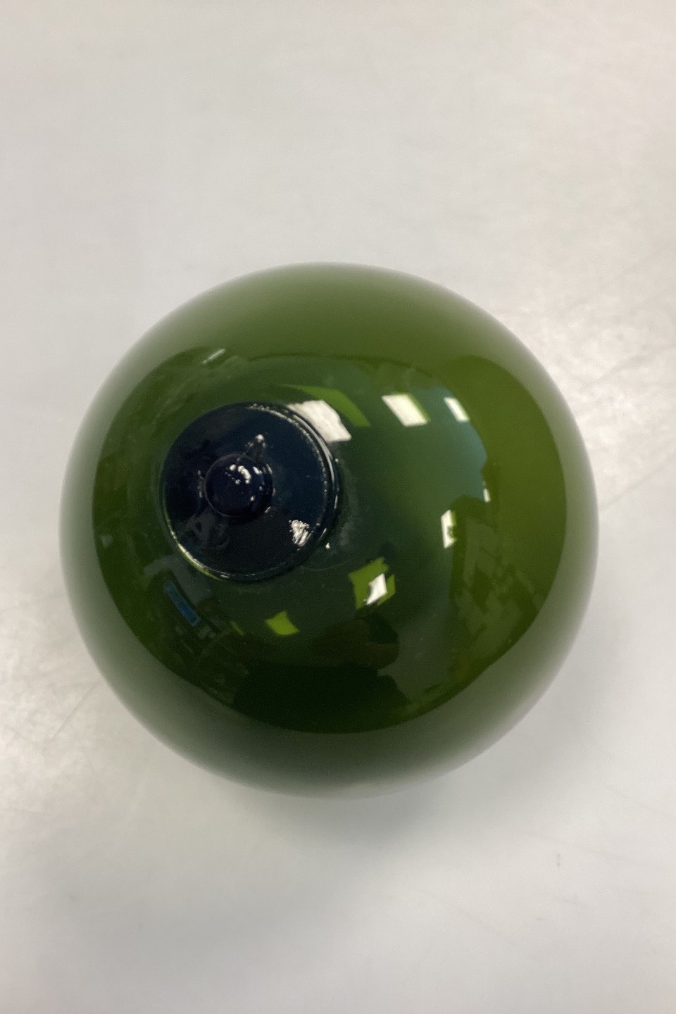 Holmegaard / Kastrup / Fyens Glass Works Decorative Ball. Also called fish balls or glass floats. Designed by Michael Bang in 1967. Color: Olive green. Hole for hanging.