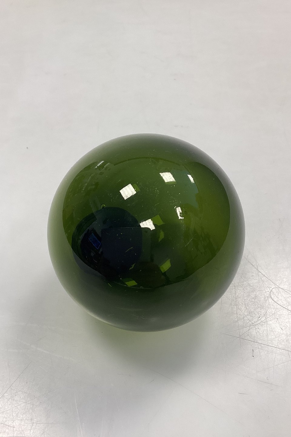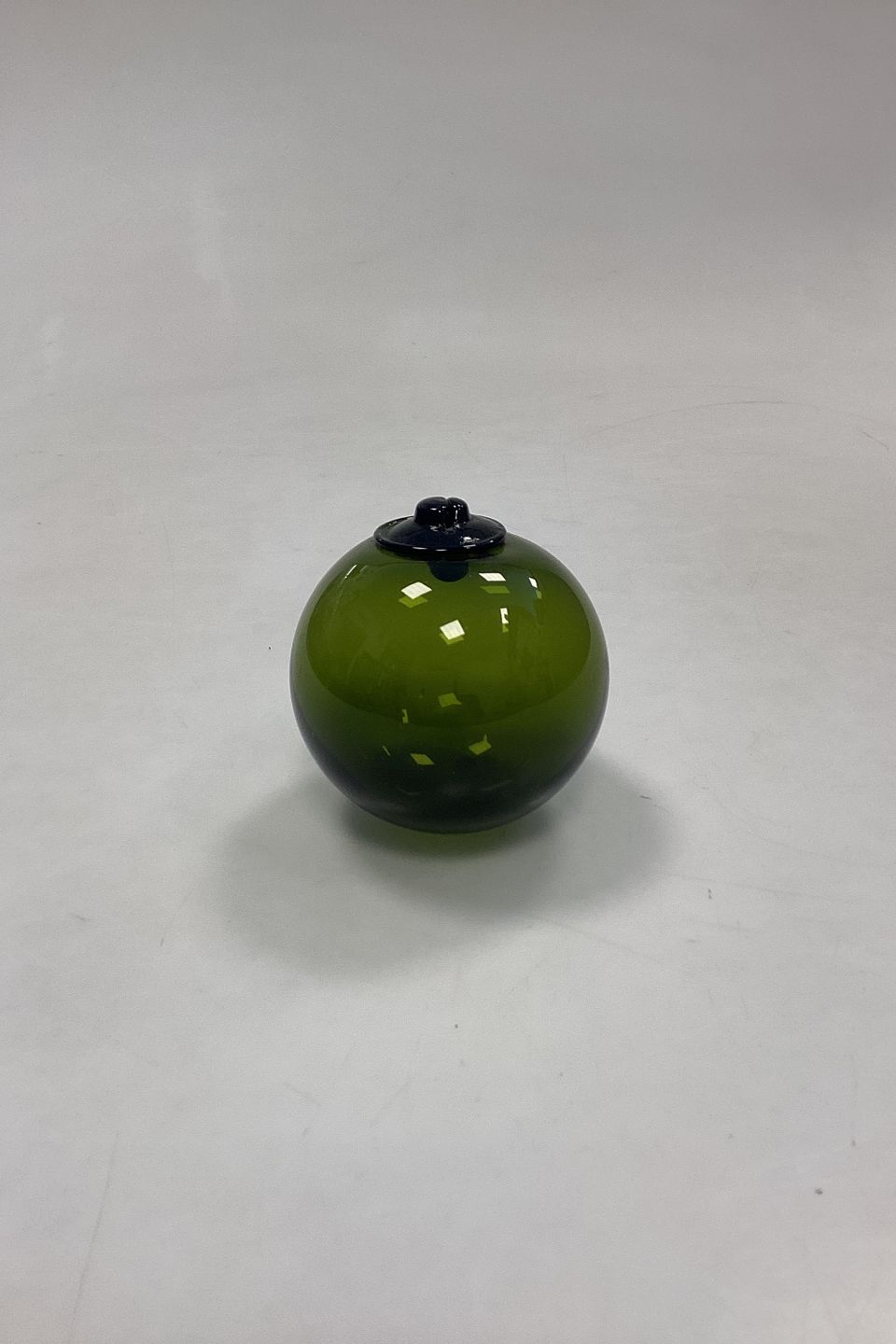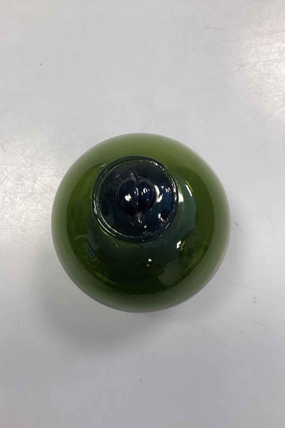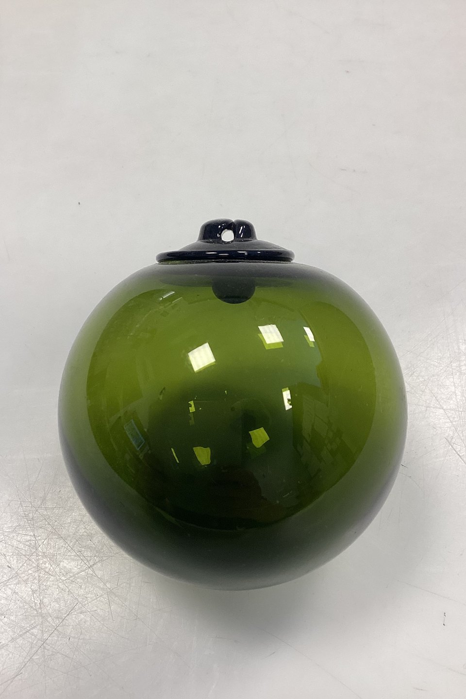 Holmegaard / Kastrup / Fyens Glass Works Decorative Ball. Also called fish balls or glass floats. Designed by Michael Bang in 1967. Color: Olive green. Hole for hanging.
