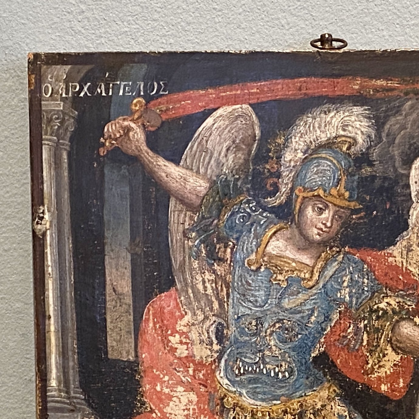 Itemnumber: 630161Greek Icon painted with the Archangel Michael defeating Satan. End of the 18th century. Dimensions: 32 x 24 cm. Thickness 1.5 cm.
