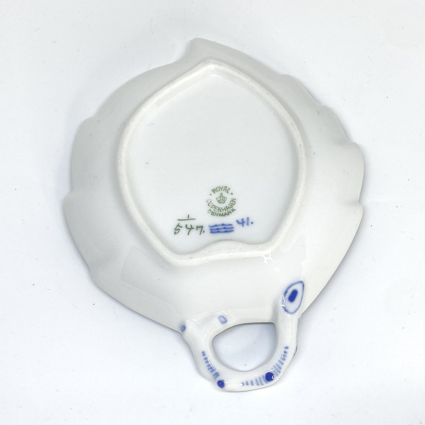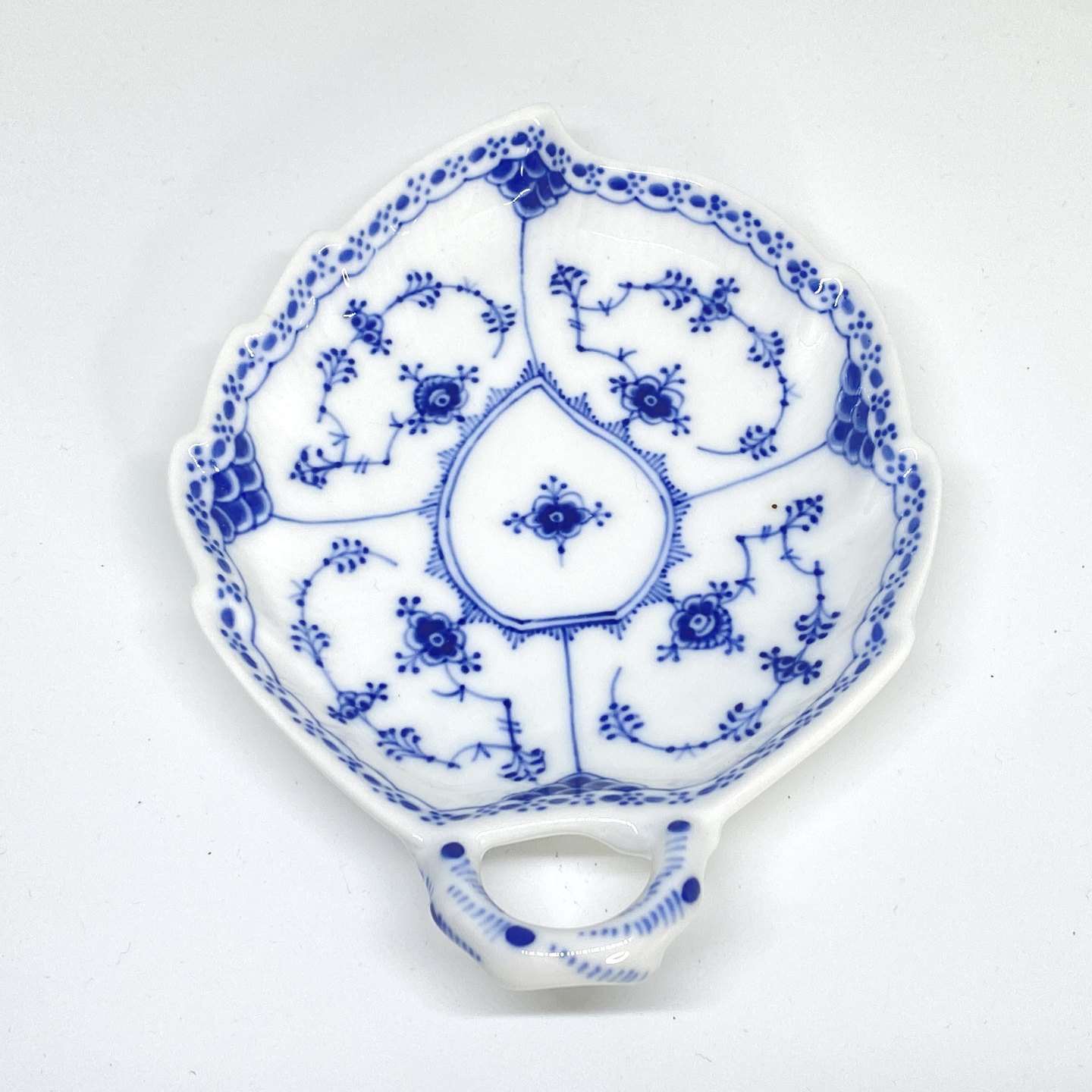Itemnumber: 630512Royal Copenhagen/Kgl Blue Fluted half-lace leaf-shaped plate with fixed handle. Decoration number 1/547. 2nd grade. Dimensions: 18.5 x 14.5 cm.