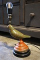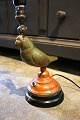 Decorative, old table lamp in the shape of a small bird in painted brass that holds the lampshade.