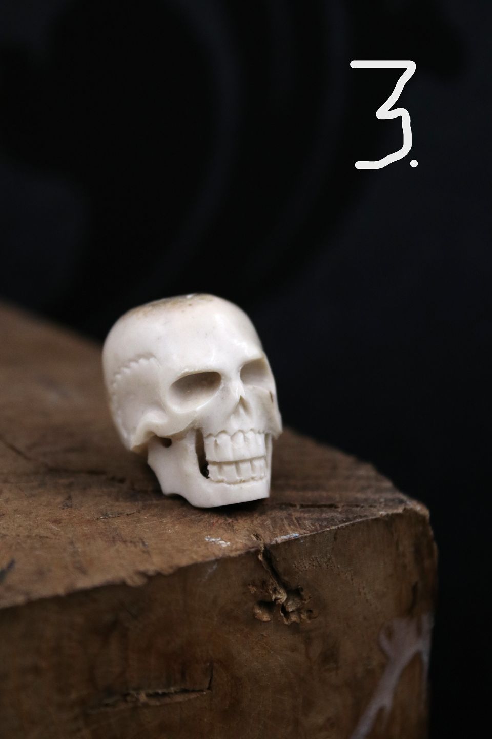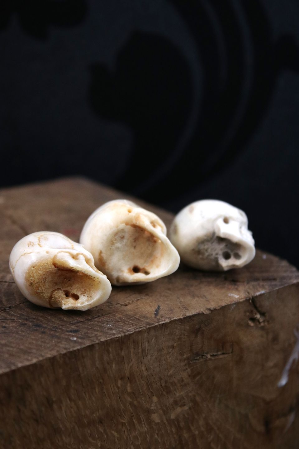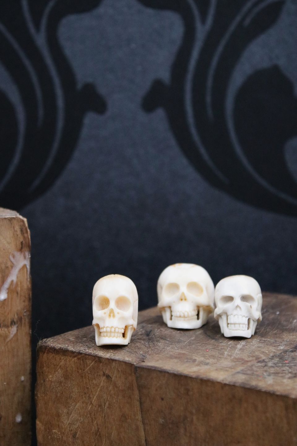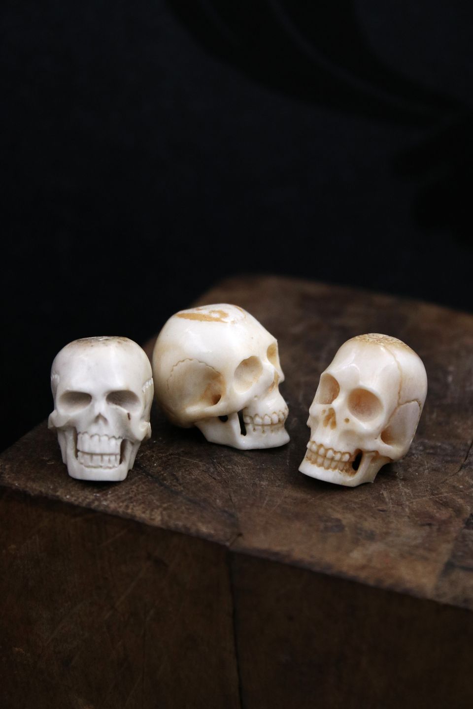 Gamle, dekorative mini kranier udskåret i horn / ben. Ca. højde: 2,6-2,8cm. Emne nummer: Mini kranier