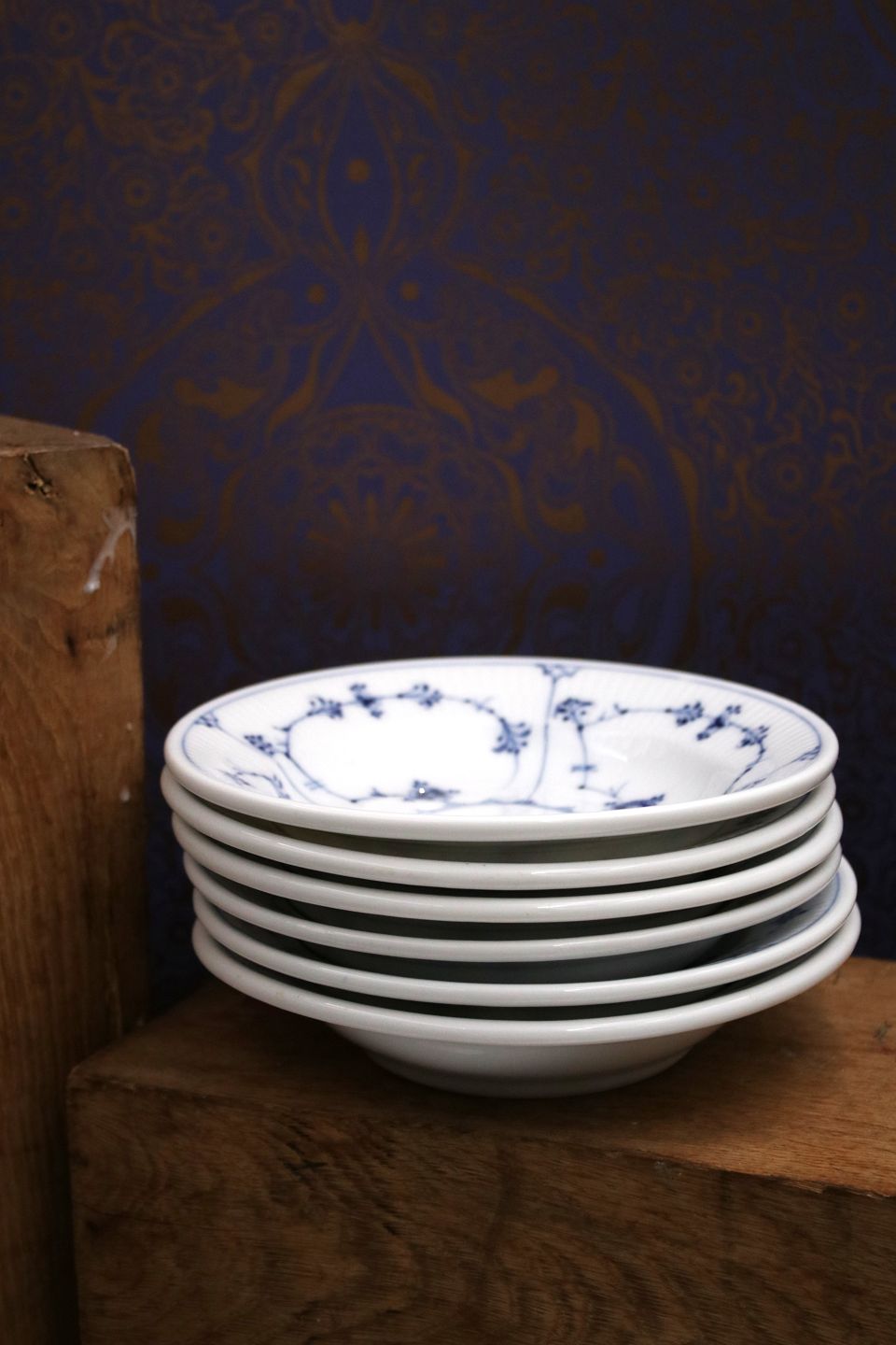 Sjælden, lille dyb tallerken i Musselmalet, Riflet med tyk kant fra Royal Copenhagen.