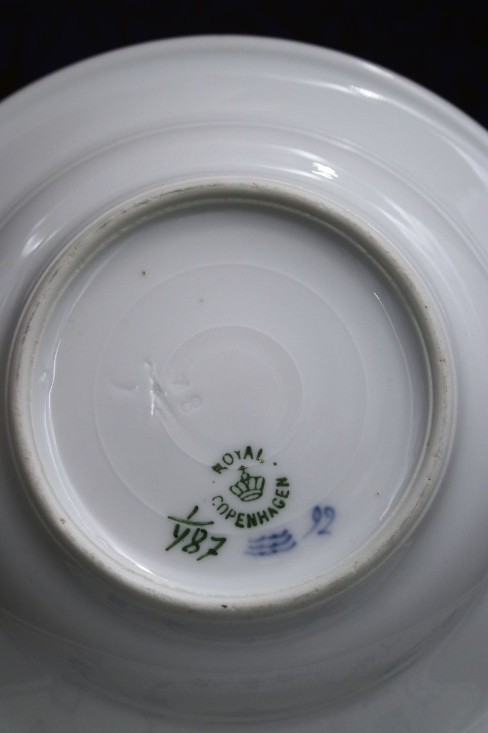 Sjælden, lille dyb tallerken i Musselmalet, Riflet med tyk kant fra Royal Copenhagen. Dia.: 16,5cm. Dekorationsnummer: 1/487. 2.sort.