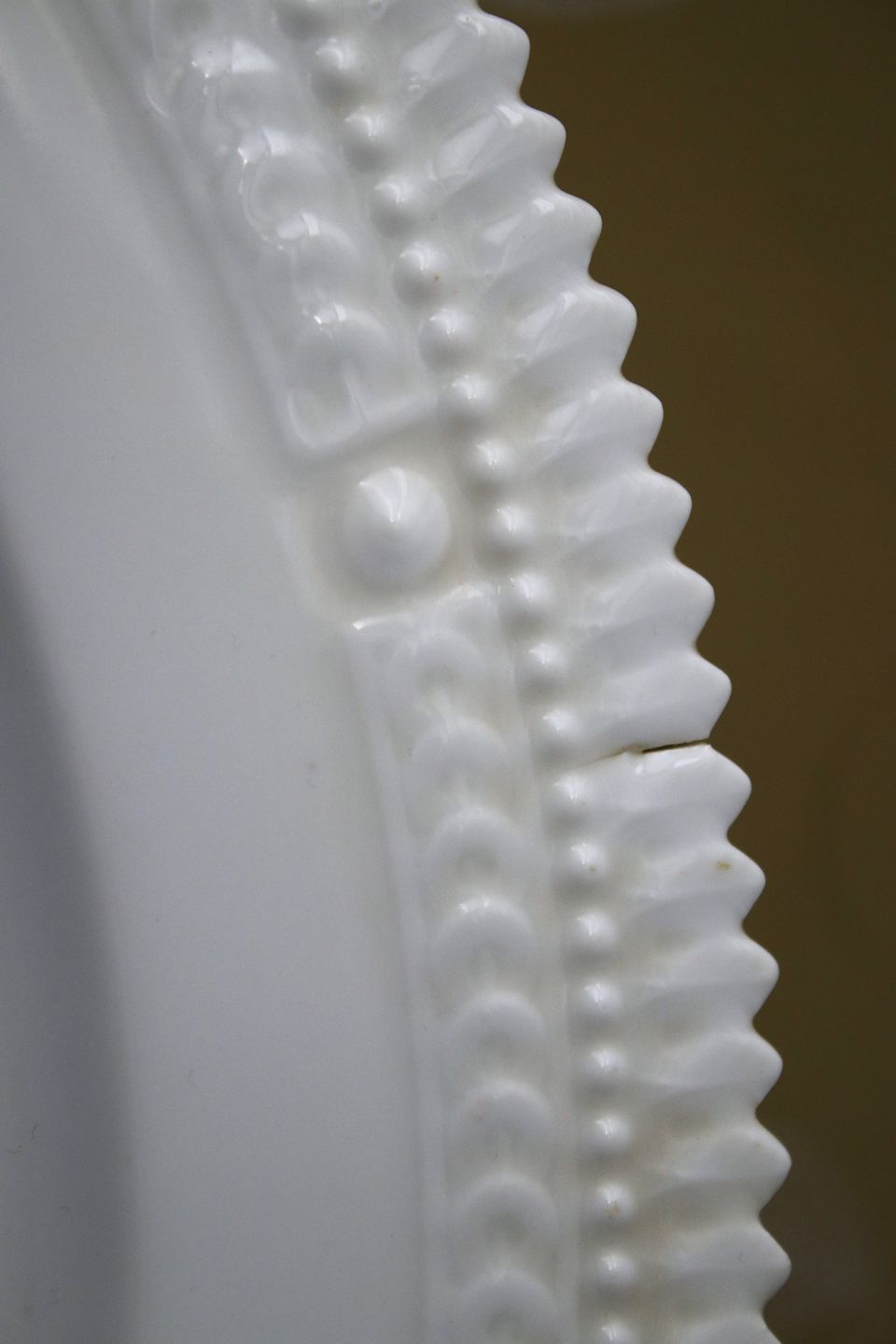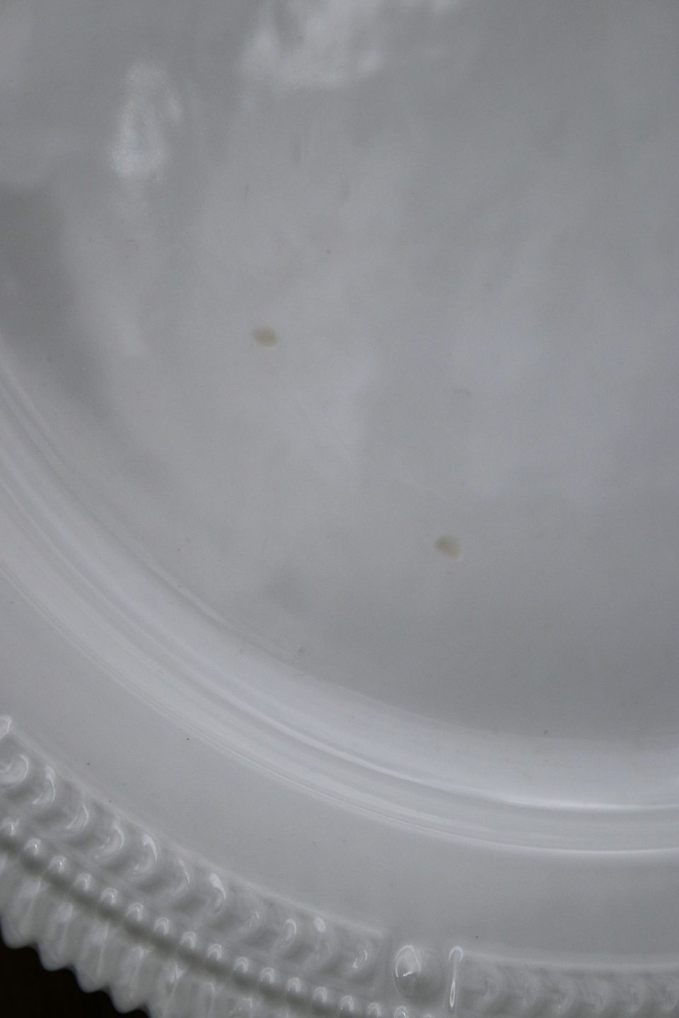 The dish has a burn crack on the edge and some small glaze marks on the bottom, see extra pictures.