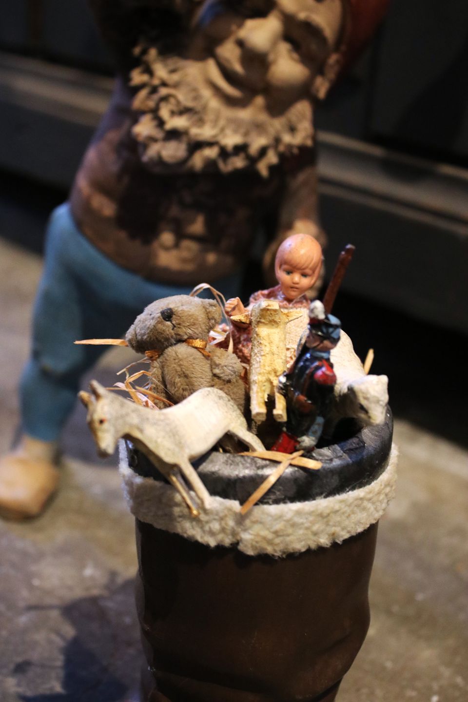 Old Christmas boot in painted papier-mâché, filled with old toys. Height: 22cm. Item number: Jule støvle med legetøj