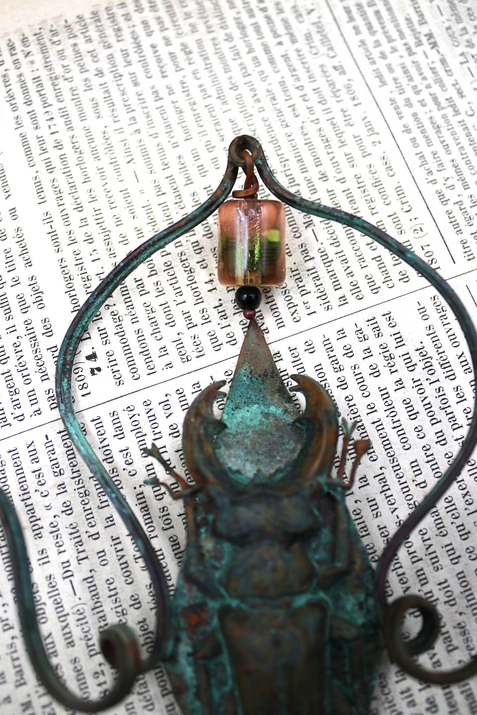Unique flower stick in copper with glass bead and insect made by jewelry artist Torben Hardenberg. Height: 31cm. Item number: Torben Hardenberg 1