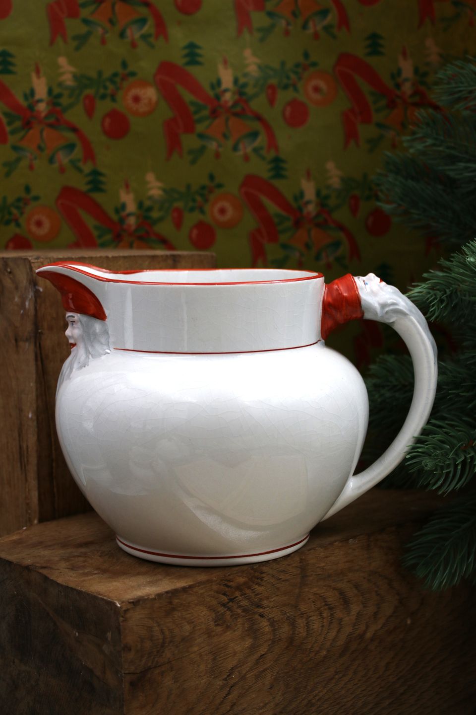 STOR gammel svensk "Herregårds" julekande i fajance med nisser på hældetuden og på hanken. H:15m. Dia.: 17cm. L: 22cm.