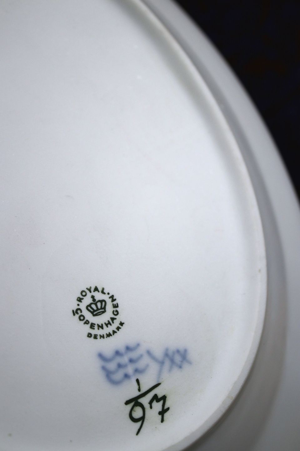Musselmalet Riflet ovalt fad fra Royal Copenhagen Fra år 1964. 30x24cm. Dekorations nummer: 1/97. 2.sort. Er i fin stand. Emne nummer: RC# 1/97. 1962