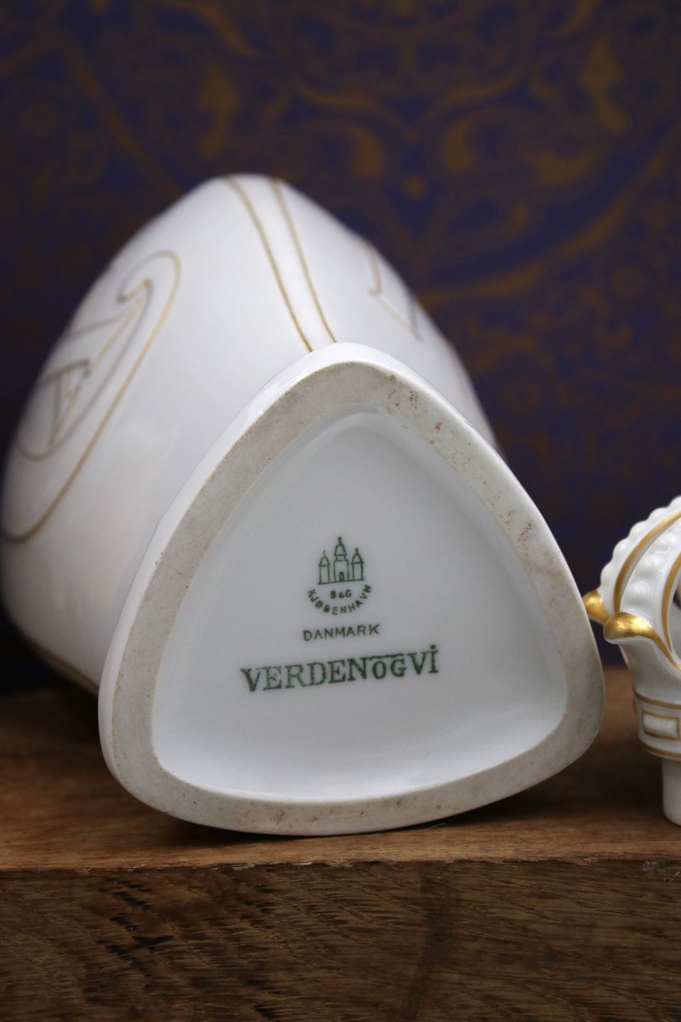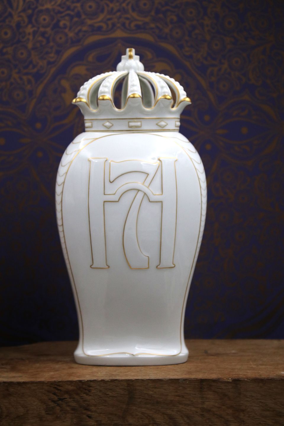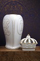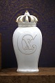 Old Bing & Grondahl vase / lidded jar in white porcelain with royal crown on top, gold decorations and King Christian d.X's monogram. Height: 24cm. Is intact and in fine condition.