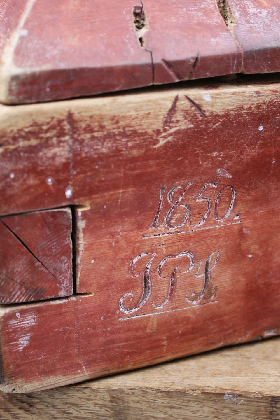 Det er dateret år 1850 med håndskårende initialer IPS.