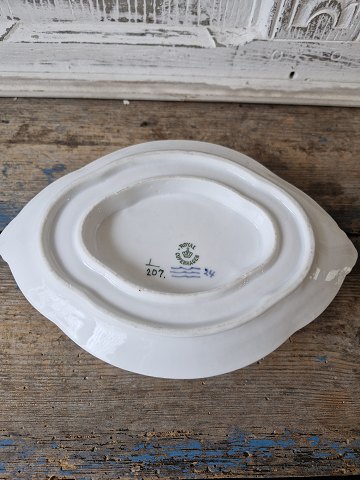 Royal Copenhagen Musselmalet riflet sauceskål uden låg No. 207, 2. sortering Højde 8 cm. Længde 24 cm. Produceret mellem 1898-1923