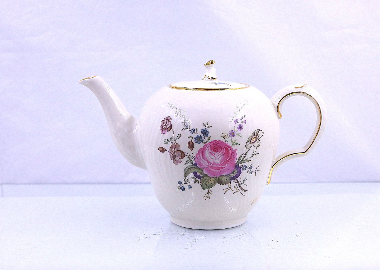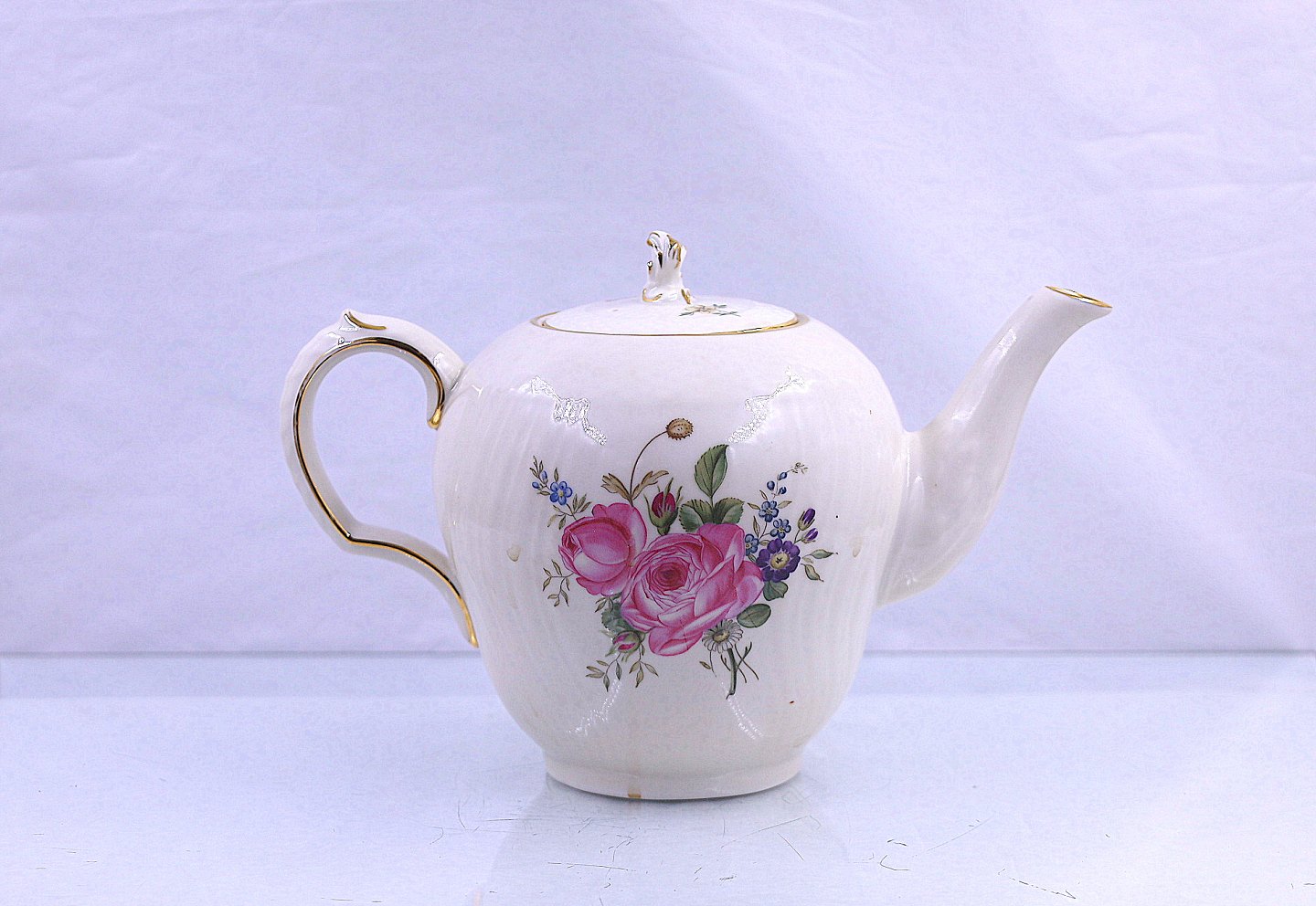 Kanden indeholder 1 liter og er i hvidt porcelæn med blomstermotiv på svejfet stel med guldkant.
