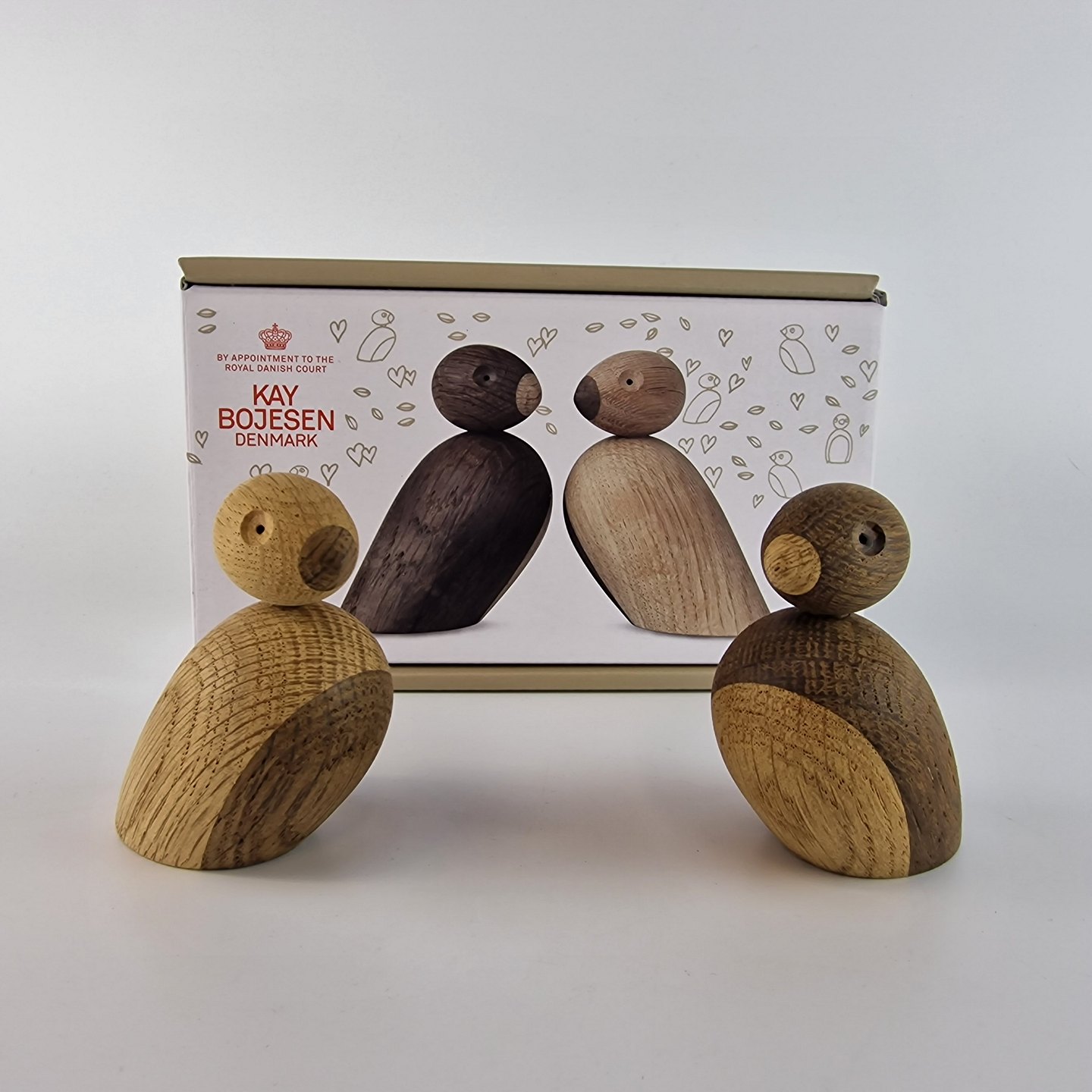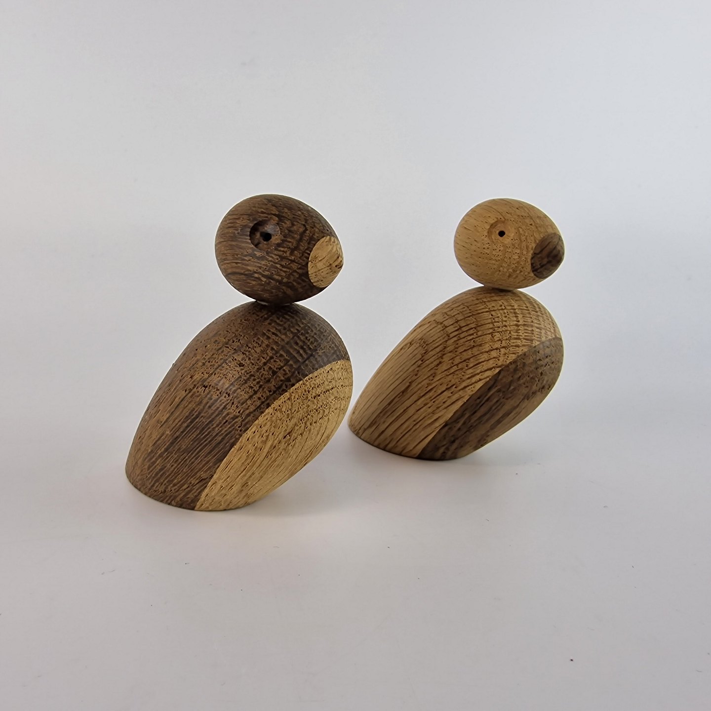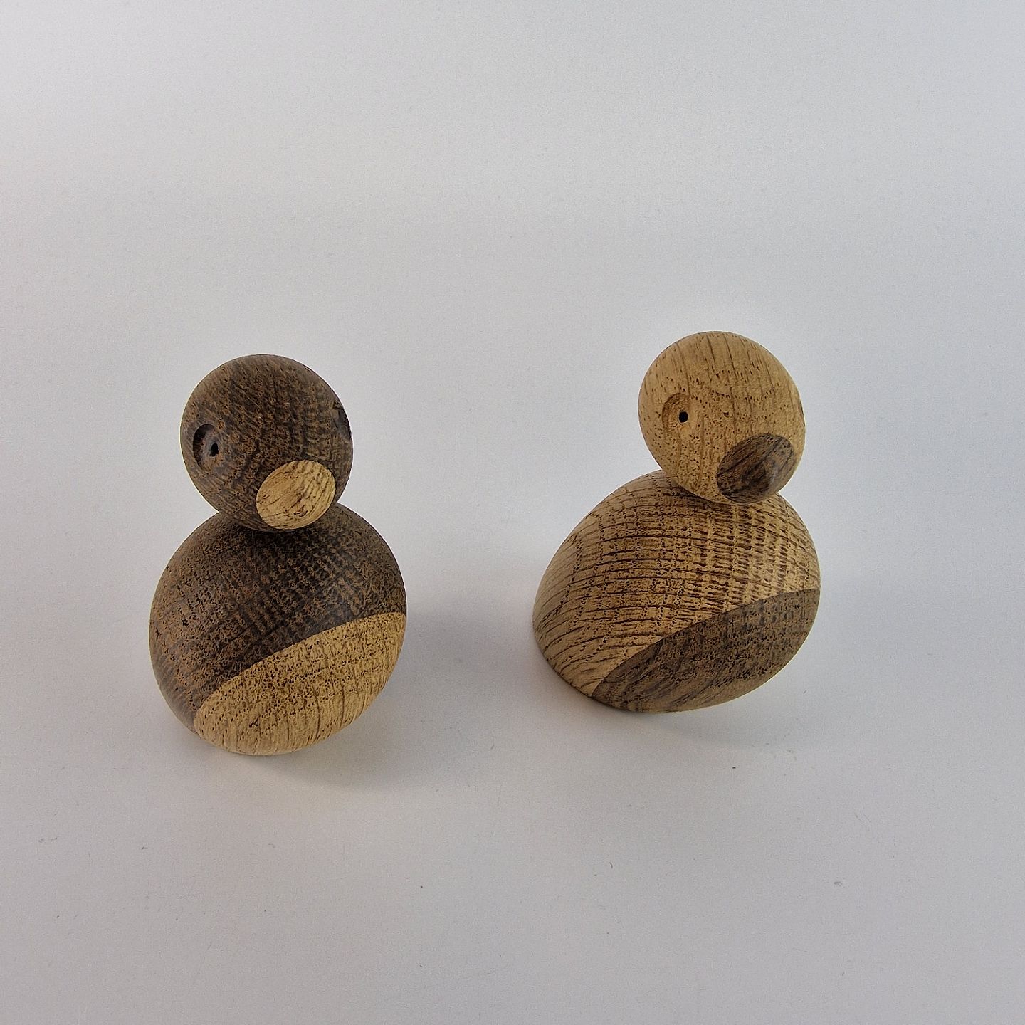 Spurvepar fremstillet i blødt træ af natureg og røget eg. Spurveparret blev designet i midten af 1930’erne