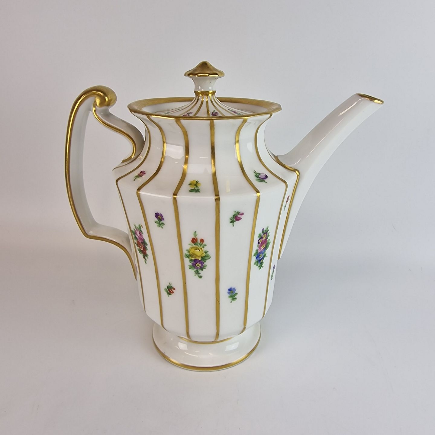 Henriette er af porcelæn og har motiver af små blomsterbuketter og guldstreger på det kantede stel.