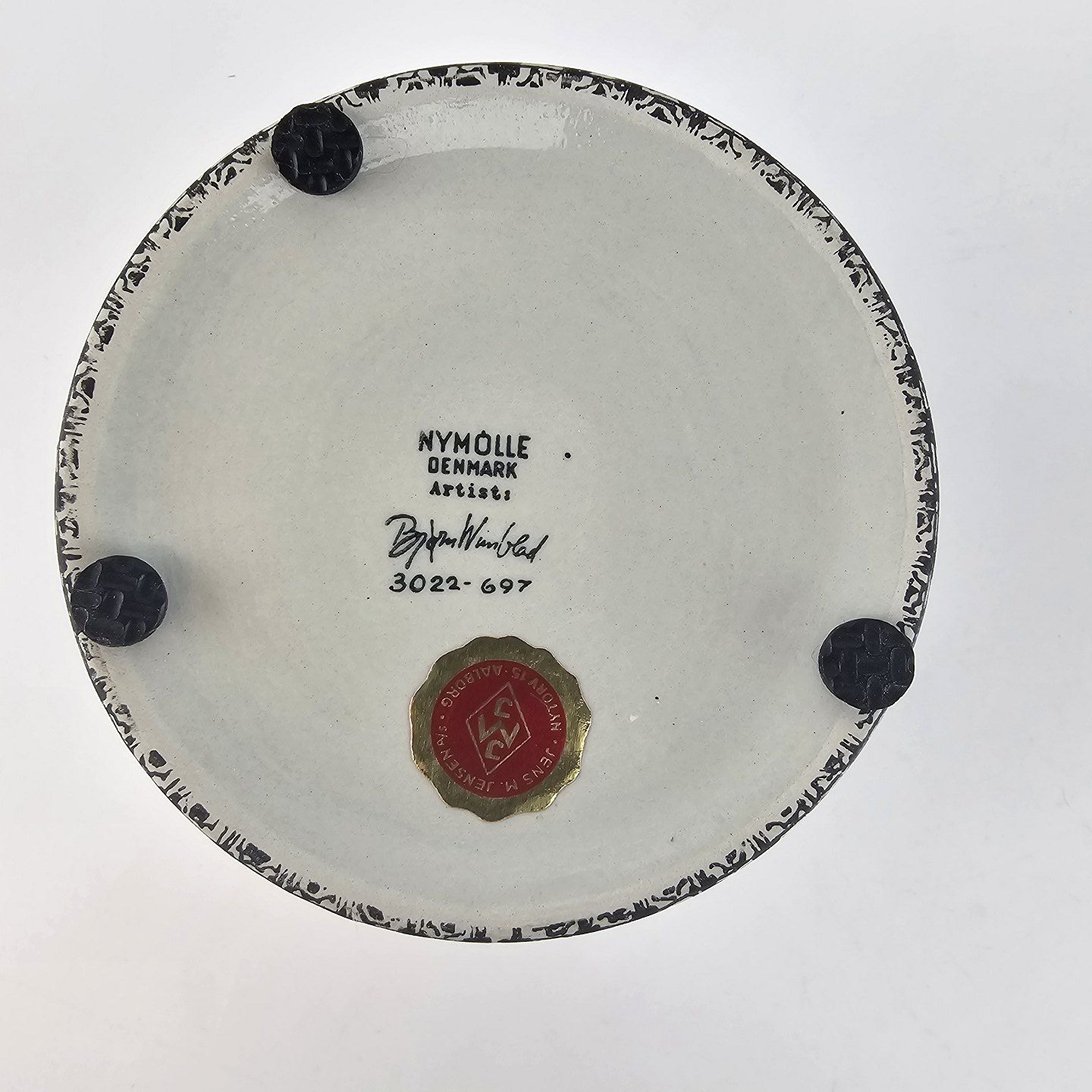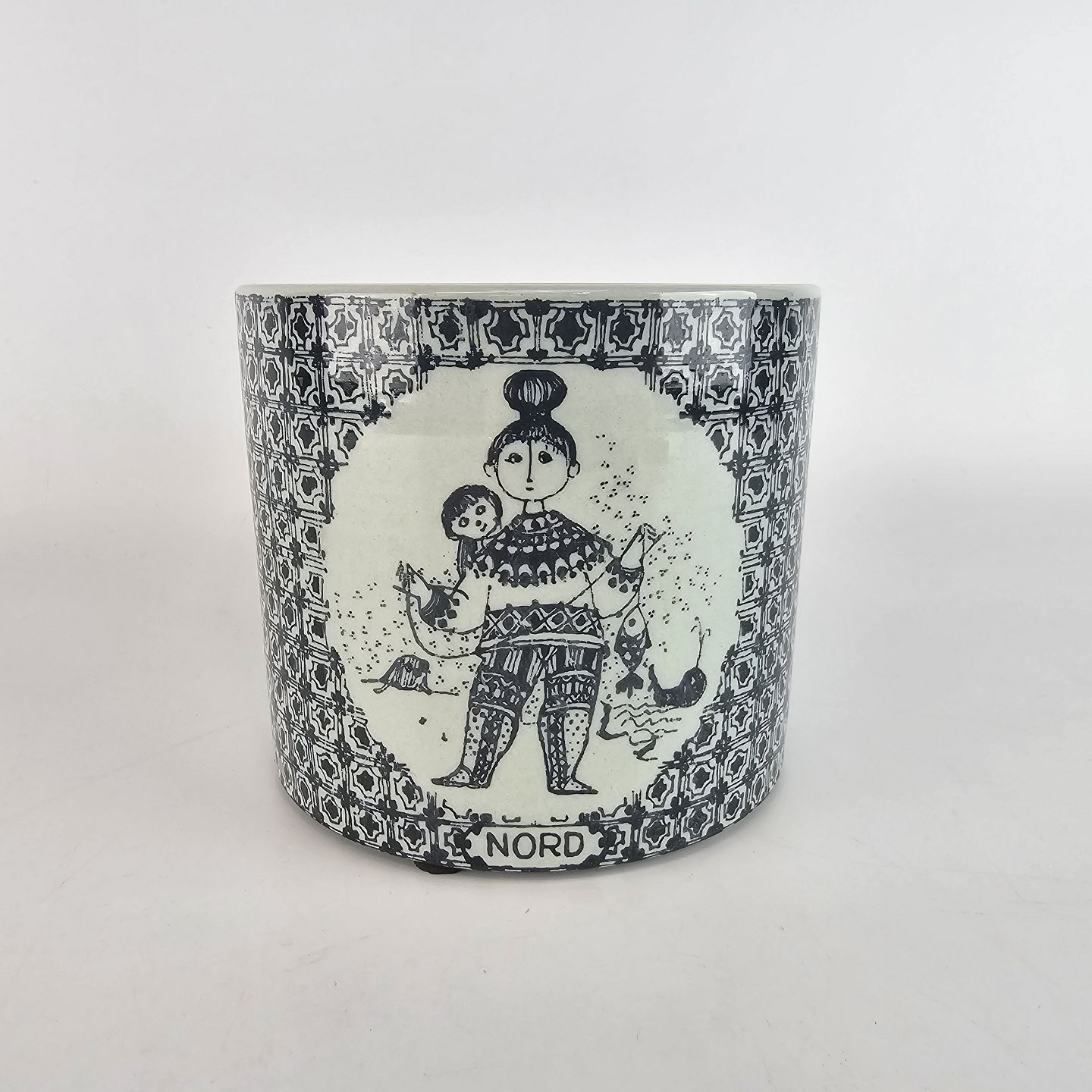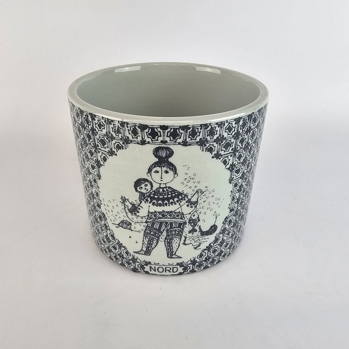 Urtepotteskjuler af keramik med det klassiske sort/hvide mønster og derudover dekoreret med en person med grønlandsk tøj, en sæl, fisk og snevejr
