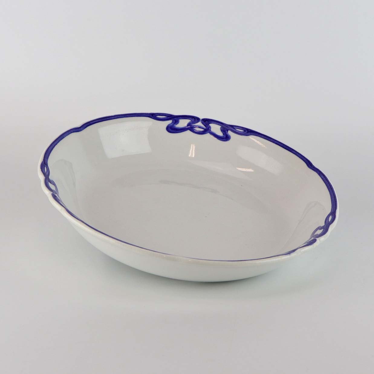 Blå Olga er hvid fajance dekoreret med blå abstrakt mønster langs kanten